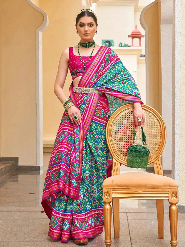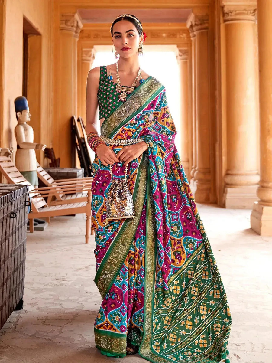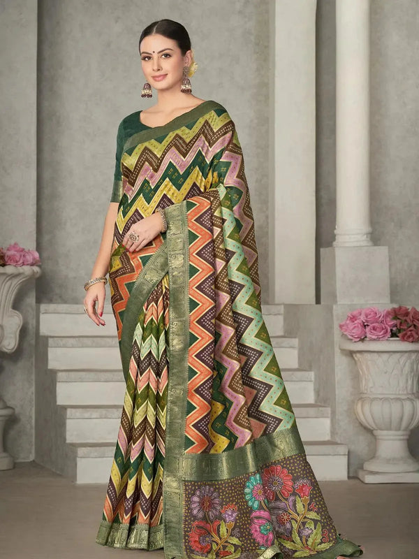 Multi Color Silk Foil Print Designer Saree with Mehandi Green Blouse For Festival Wear