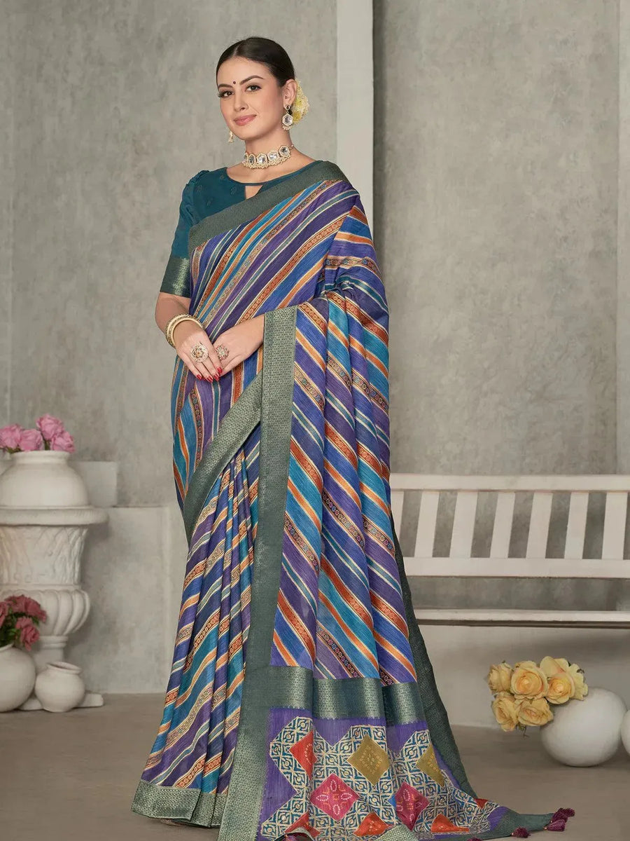 Multi Color Silk Foil Print Designer Saree with Silver Border For Festival Wear