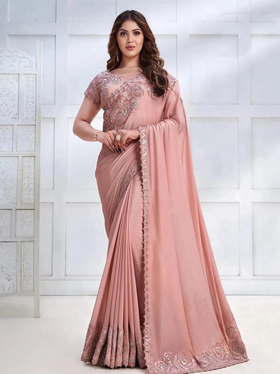 Peach Satin Silk Saree with Sequins and Diamond Work For Occasion Wear