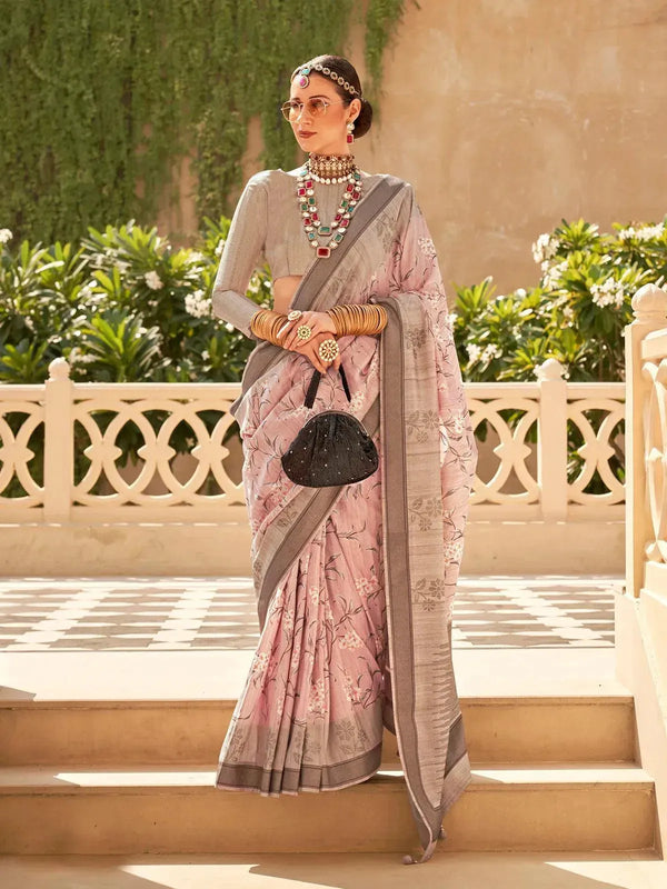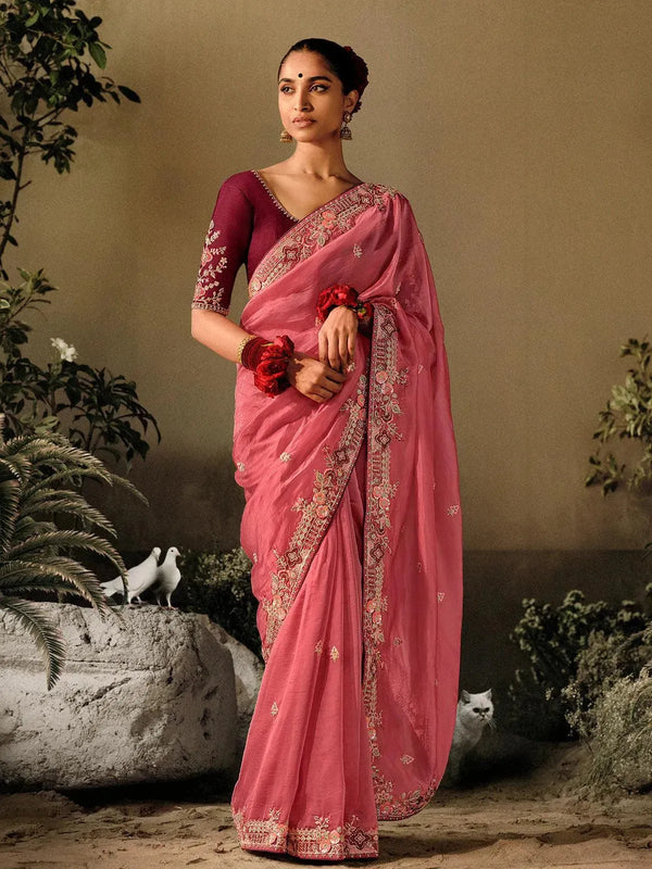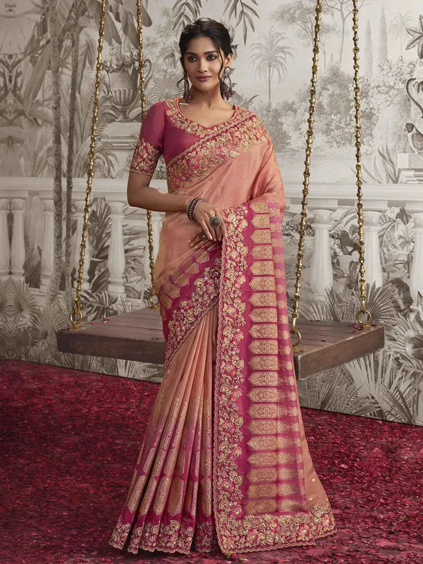Peach Organza Silk Saree with Pink Silk Blouse for Festivals & Parties