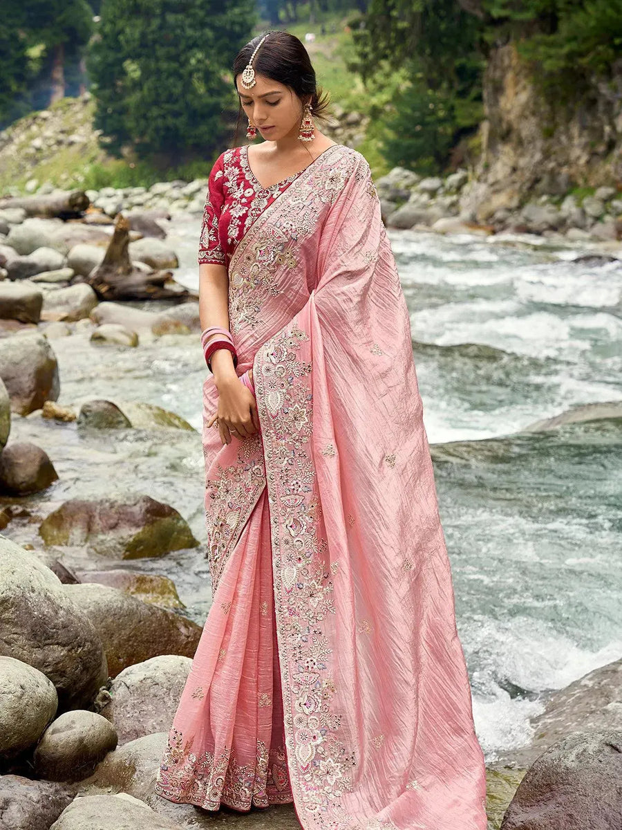 Peach Designer Silk Saree With Heavy Embroidery Work For Bridal Wear