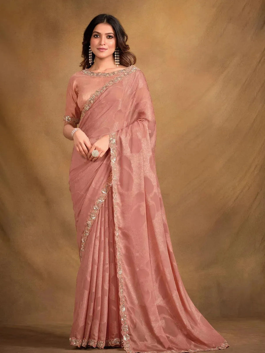 Peach Organza Silk Saree with Designer Embroidery Work For Parties & Weeding