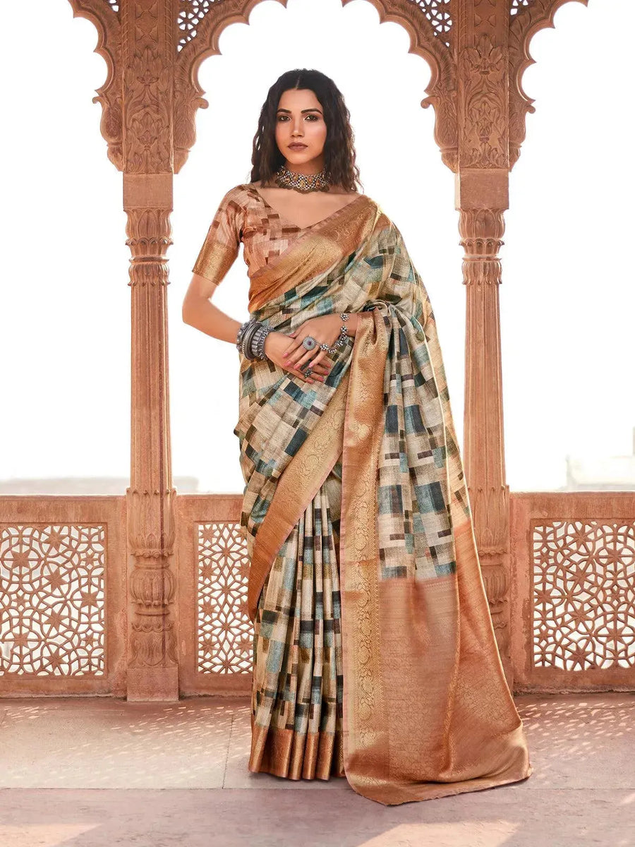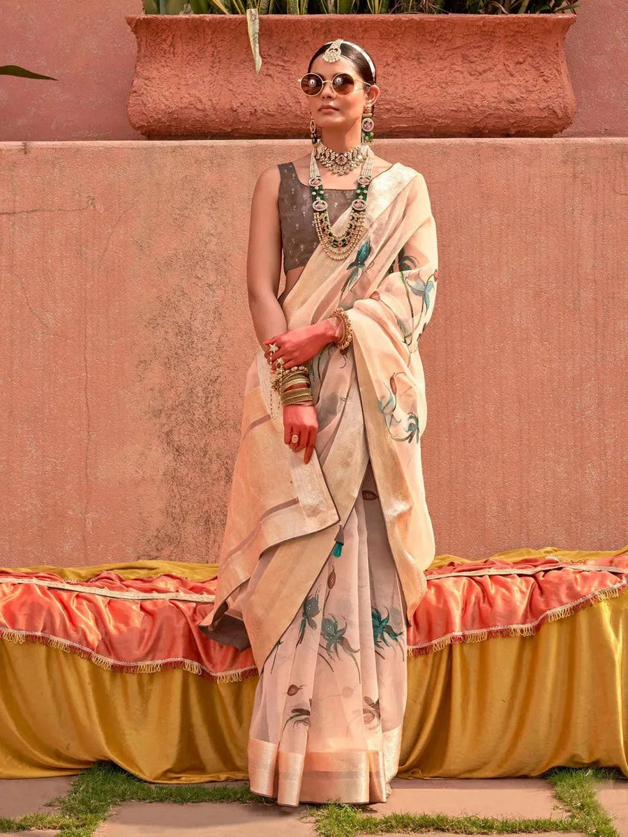 Peach Super Raw Silk Saree with Beige Blouse for All Occasion