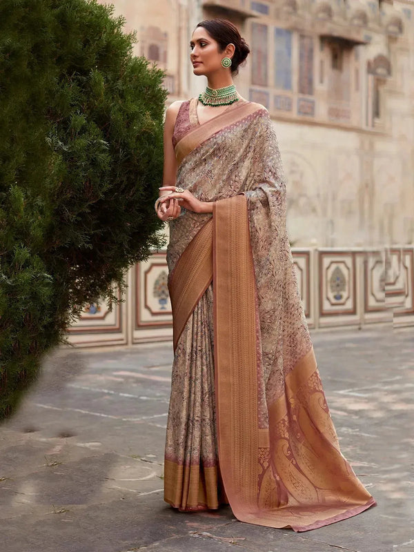 Peach Organza Silk Saree with Brown Silk Blouse for Festivals & Parties