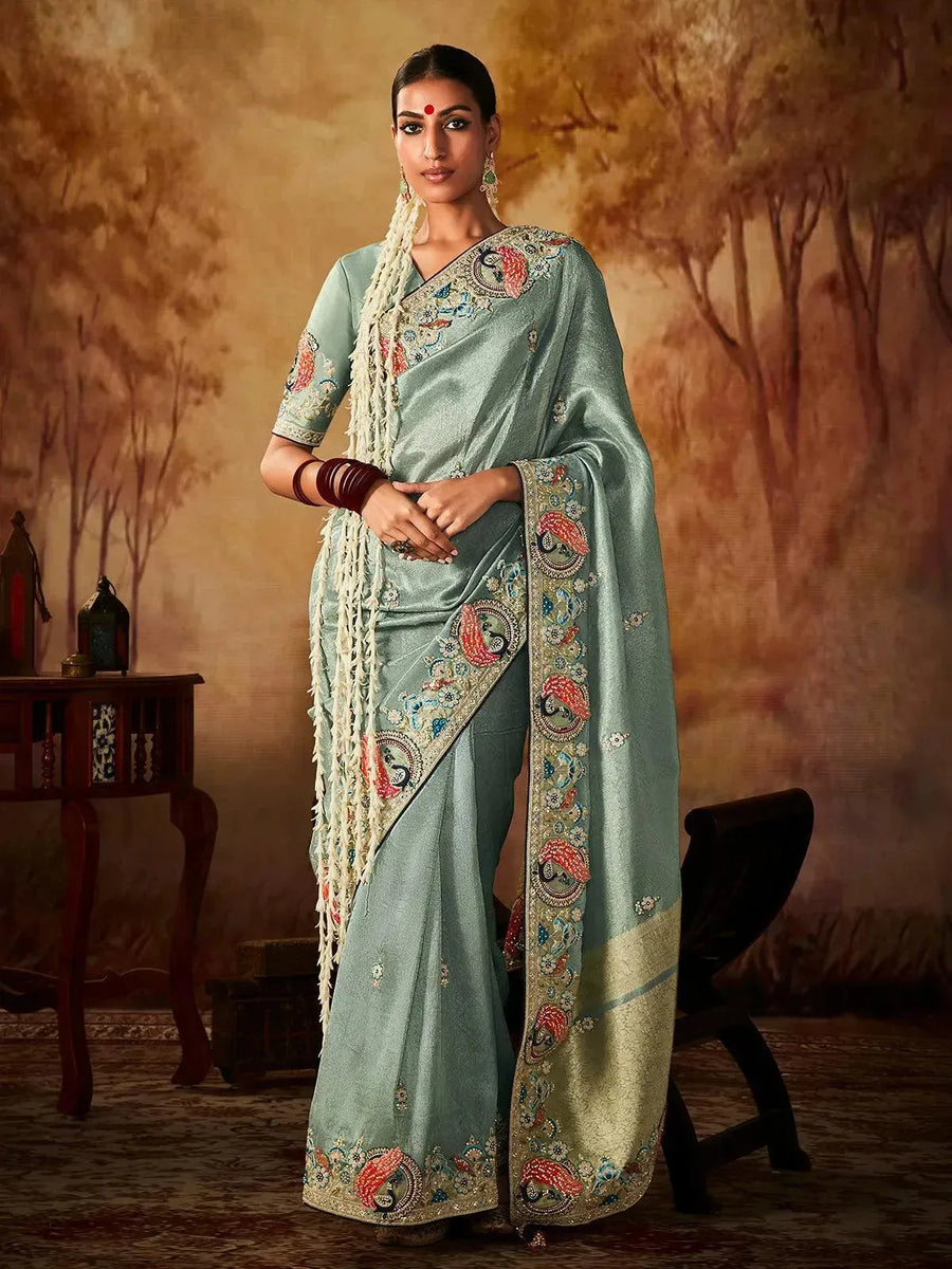 Light Sea Green Color Embroidered Banarasi Silk Saree