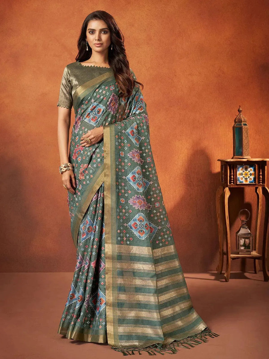Sea Green Color Printed Silk Saree With Zari Border