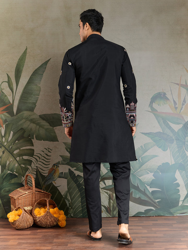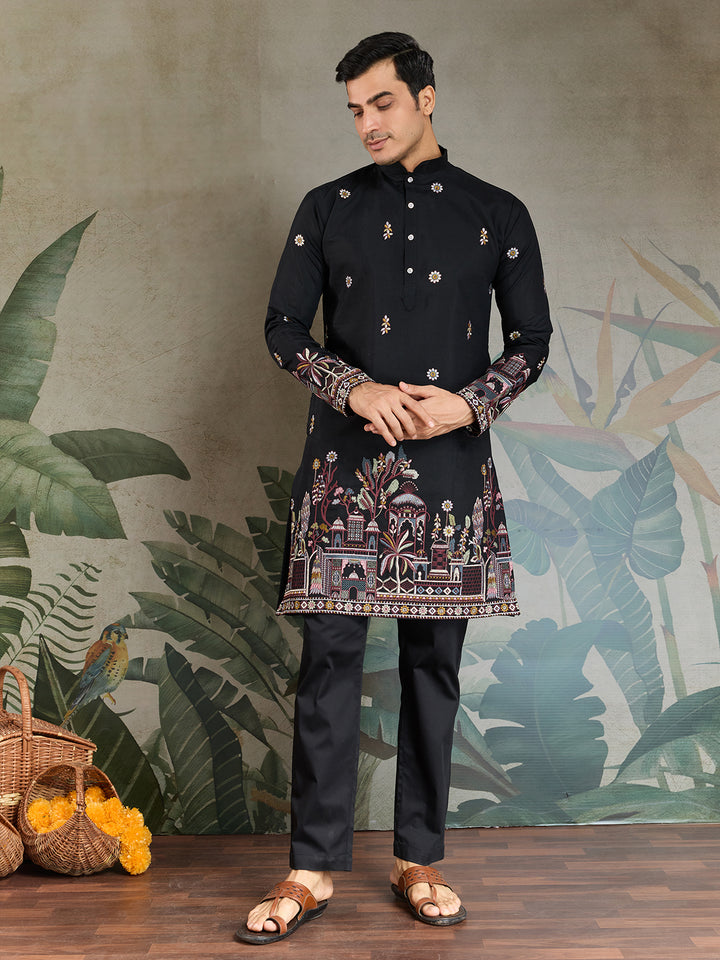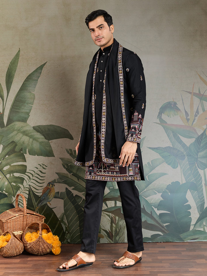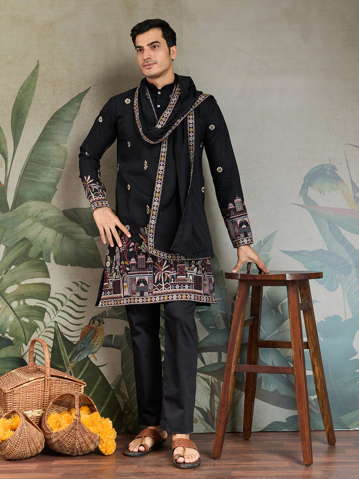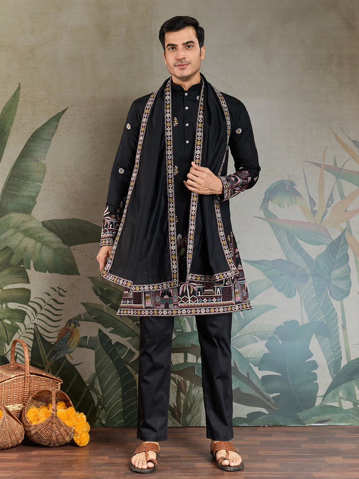 Elevate your ethnic wardrobe with this black viscose silk kurta for men, meticulously designed for weddings and festive occasions. Featuring premium thread and sequin embroidered work, this kurta showcases a luxurious...