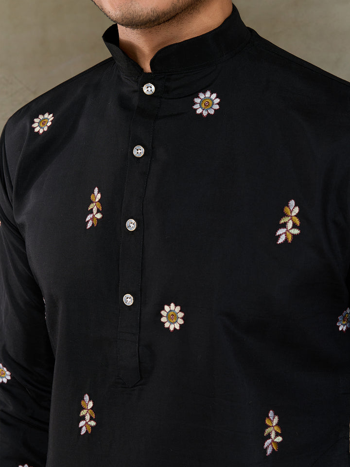 Elevate your ethnic wardrobe with this black viscose silk kurta for men, meticulously designed for weddings and festive occasions. Featuring premium thread and sequin embroidered work, this kurta showcases a luxurious texture with a modern silhouette that complements every body type. The rich black tone adds a royal charm, making it an ideal choice for groomsmen or stylish wedding guests. Crafted with breathable viscose silk fabric, it ensures all-day comfort while maintaining a regal presence.