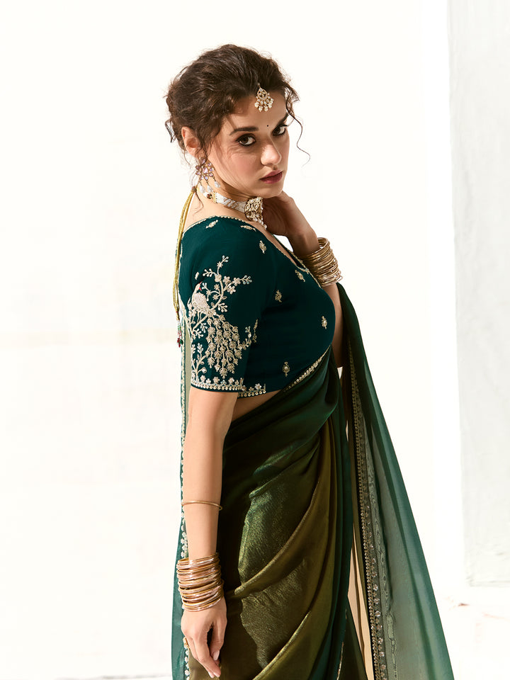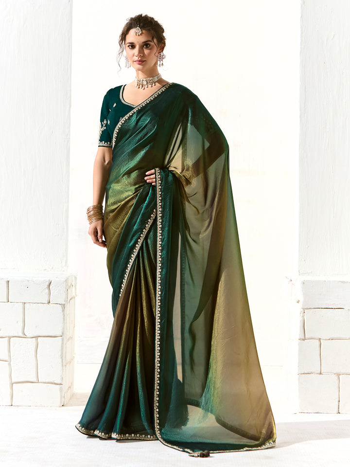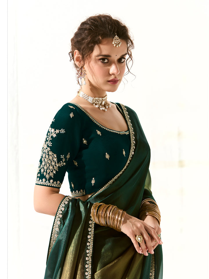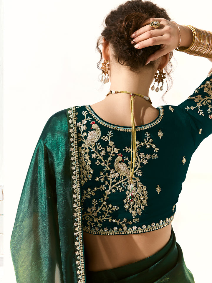 Designer Organza Tissue Embroidery Saree In Dark Green
