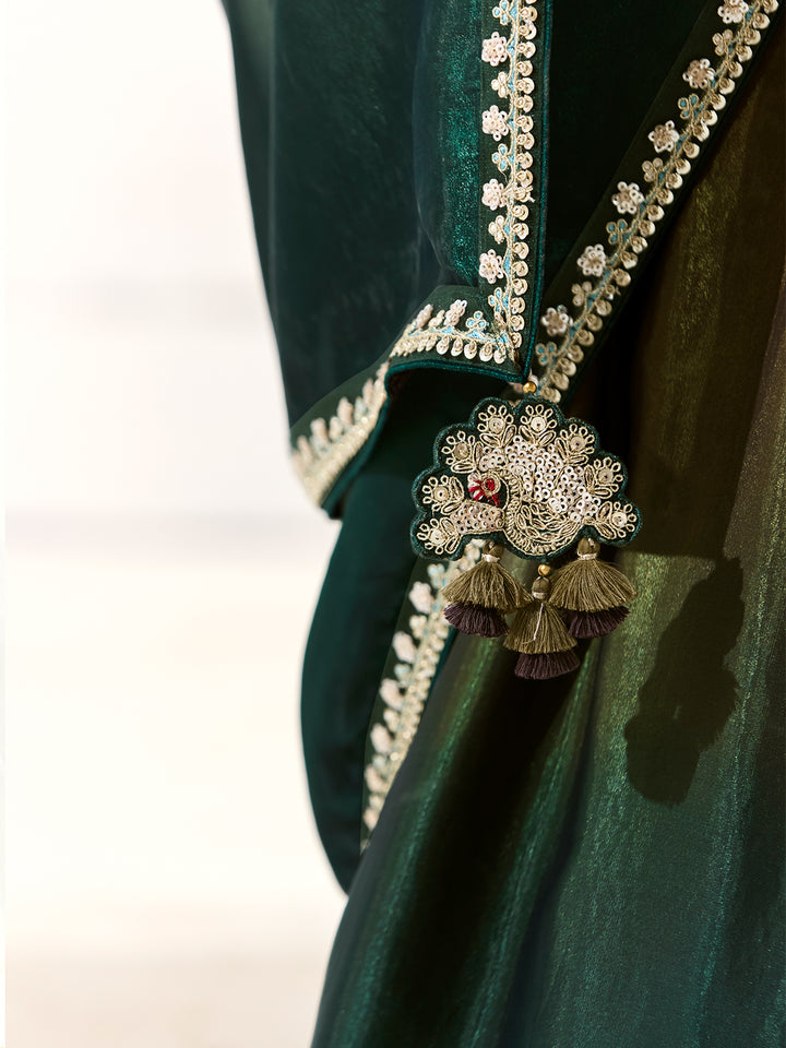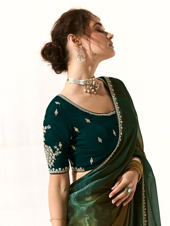 Step into timeless elegance with our Dark Green Organza Tissue Saree, designed for those who embrace grandeur with grace. Crafted in premium organza tissue fabric, this saree features exquisite heavy border work and delicate butta motifs scattered across the body — a luxurious ensemble perfect for festival wear and party occasions. The rich dark green hue is trending this season, offering a regal touch that flatters all skin tones and photographs beautifully in natural and artificial light.