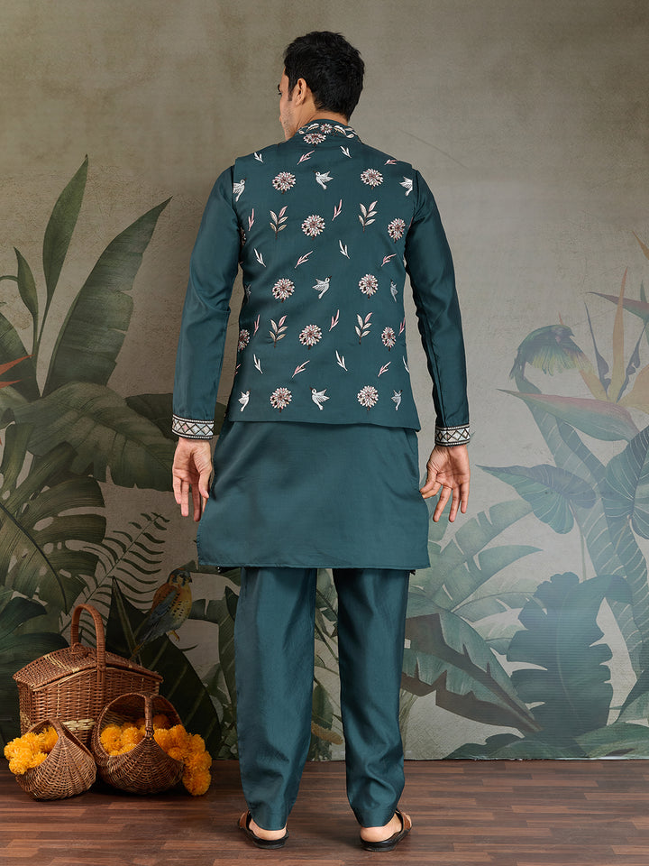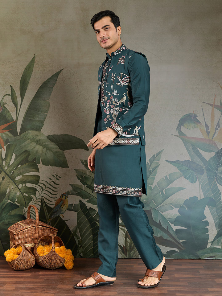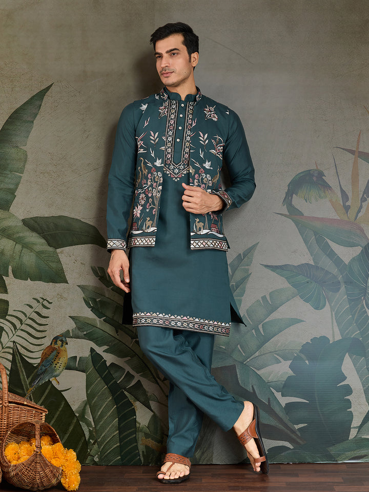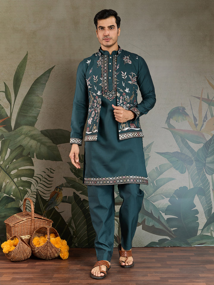 Embroidered Green Viscose Silk Kurta Koti Set for Men