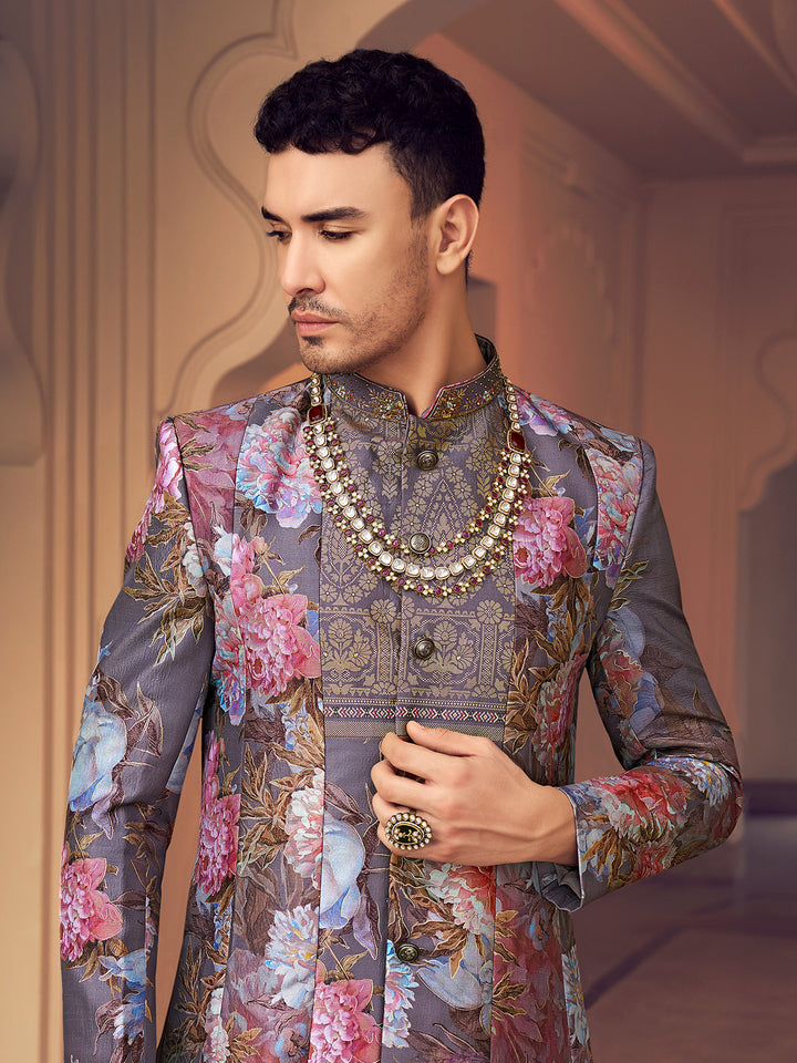 Grey Men's Indo-Western Silk Foil Print Wedding Outfit