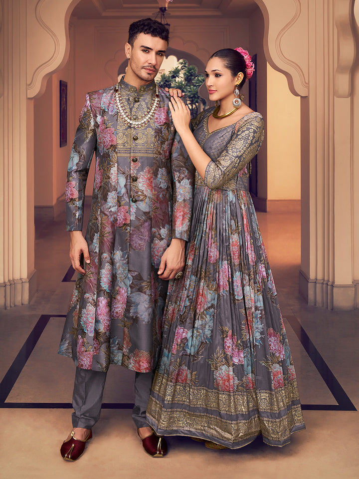 Grey P.V Silk Sherwani for Men, crafted with premium foil print and intricate handwork. Tailored for the modern groom and fashion-forward men, this Indo-Western Sherwani fuses traditional charm with a contemporary...