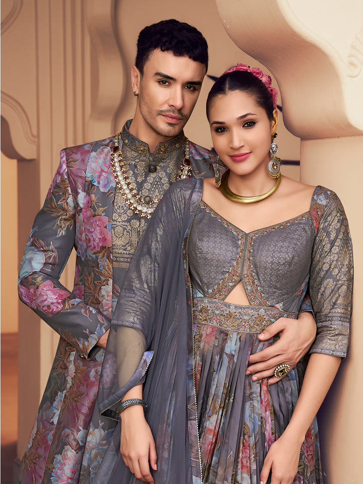 The versatile grey tone complements all skin tones and adds a sophisticated touch to your ethnic wardrobe. Pair it with churidar, dhoti pants, or even trousers for a bold Indo-fusion statement. Whether you're the groom, groomsman, or a guest, this designer sherwani ensures you stand out with effortless grace. Ideal for wedding season 2025, cultural functions, and high-profile celebrations, this piece captures the essence of royal Indian fashion with a modern edge.