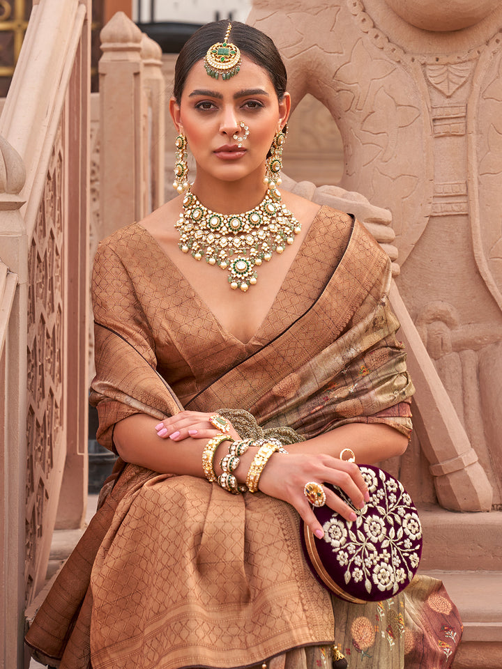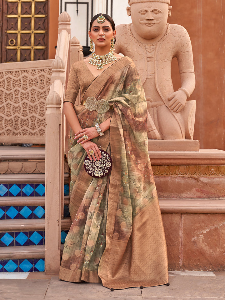 Paired with a matching brown organza digital print blouse, this saree offers both comfort and contemporary sophistication. Whether you’re attending a festive gathering, family event, or styling for an Instagram-worthy traditional look, this outfit delivers top-tier fashion appeal. Its multicolor design suits all skin tones and makes accessorizing effortless. Shop now to add a top-trending, Google-worthy festival saree to your wardrobe—perfect for standing out in photos and ranking top in timeless ethnic style.