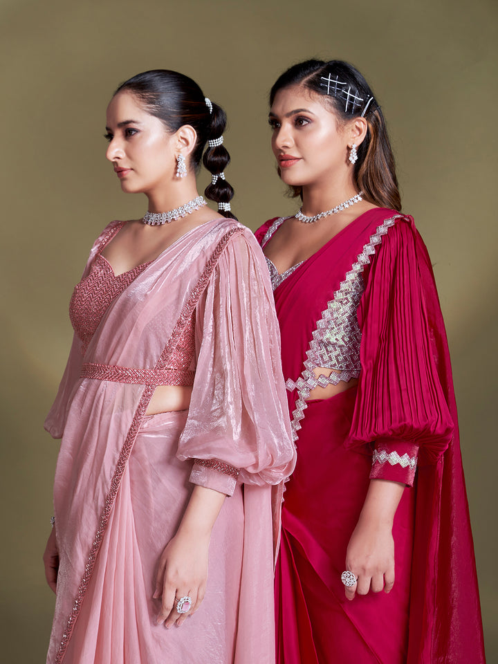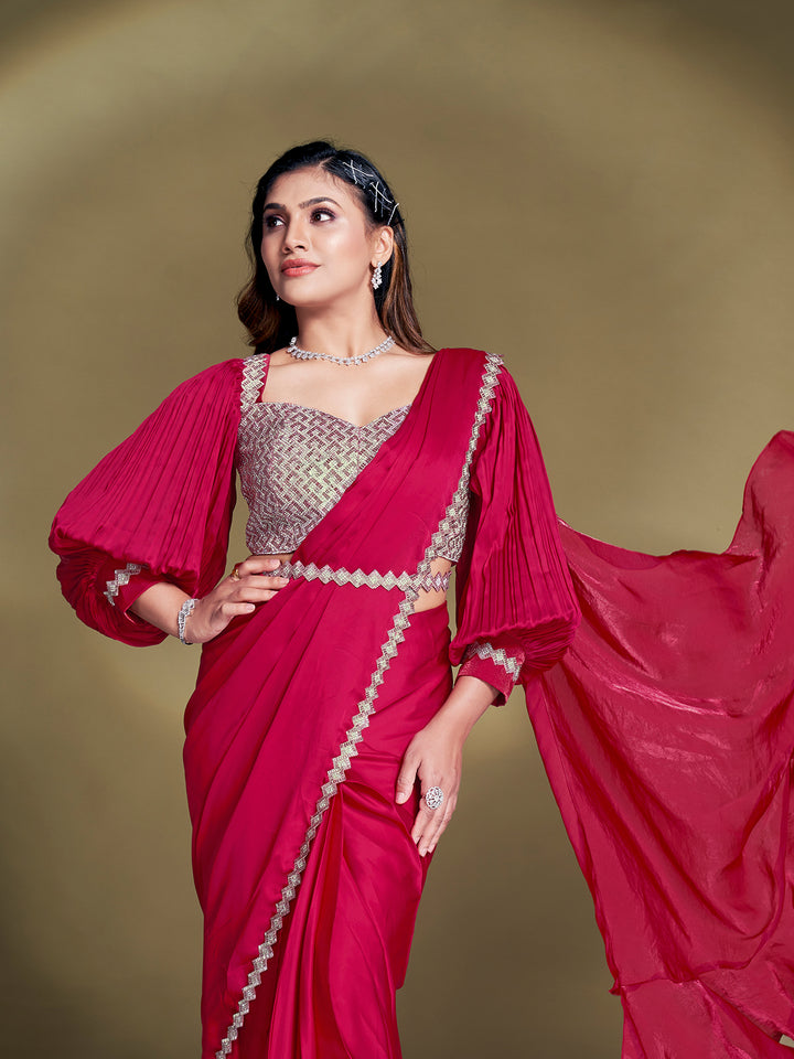 Turn every head at your next celebration with this Rani Pink Ready-to-Wear Crepe Satin Silk Saree, crafted for effortless elegance. Featuring rich sequins, delicate beads, and traditional Aari work, this saree shines with detailed craftsmanship that’s perfect for party wear, weddings, and ceremonial occasions. The luxurious crepe satin silk fabric drapes beautifully, offering a soft, glossy finish that flatters every body type. It’s a ready-to-wear style—no pleating required—making it a glamorous yet convenient choice for modern women who love tradition with ease.