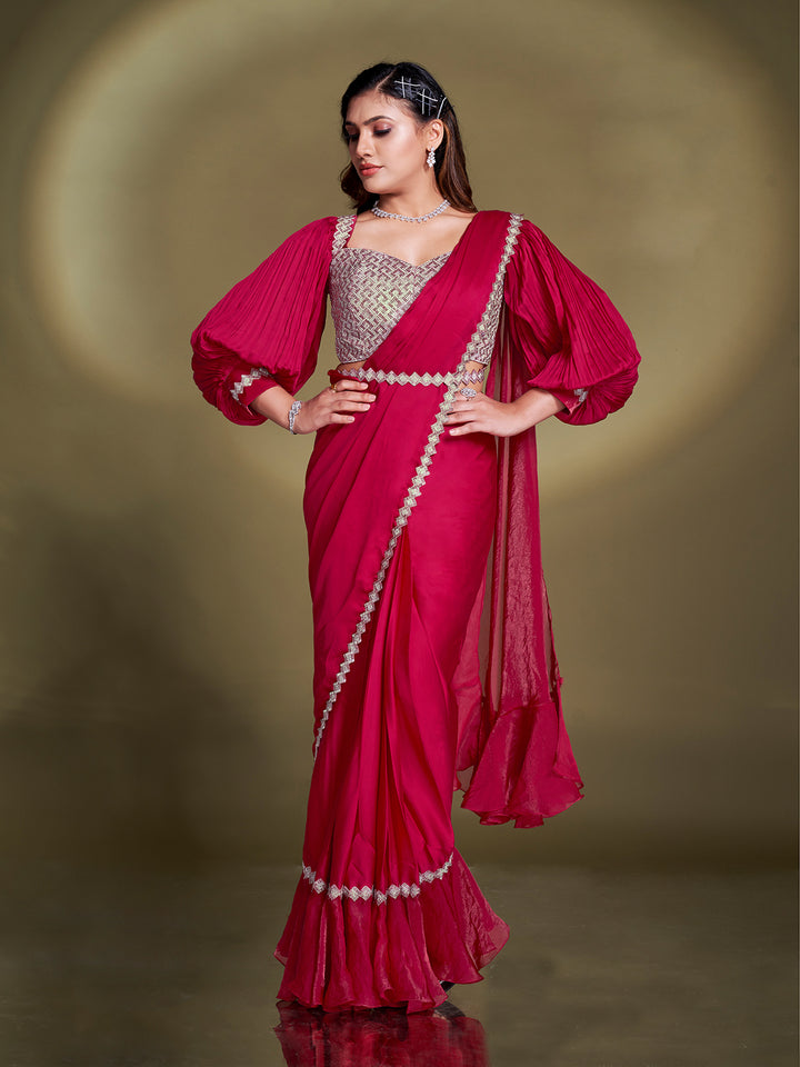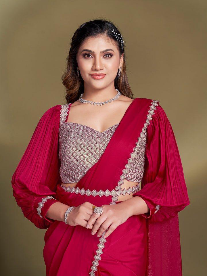 Rani Pink Crepe Satin Silk Saree with Sequins & Beads Work
