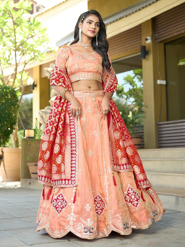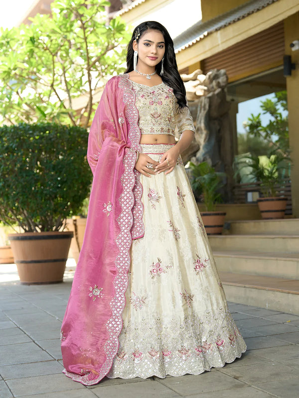 Off-White Silk Lehenga Choli with Orange Dupatta for Wedding Wear