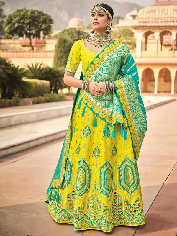 Fancy Yellow and Green Silk Designer Lehenga Choli for Wedding