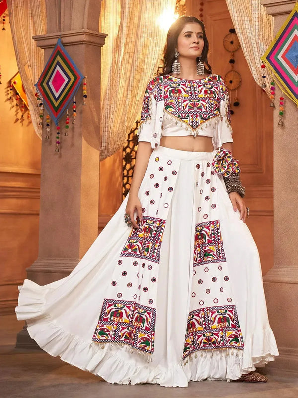 White Gajji Silk Navratri Lehenga Choli with Digital Print & Mirror Work