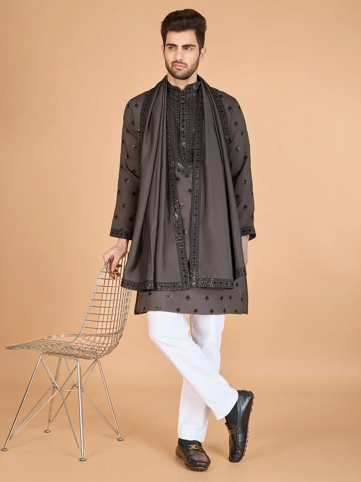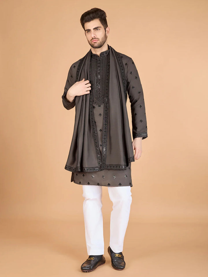 Upgrade your ethnic wardrobe with this premium brown viscose silk kurta for men, featuring intricate thread and sequin embroidery work. Crafted from luxurious viscose silk, this kurta offers a soft texture, rich sheen, and unmatched comfort. Whether it's a festive celebration, wedding function, or traditional gathering, this stylish embroidered kurta adds a regal touch to your ensemble.