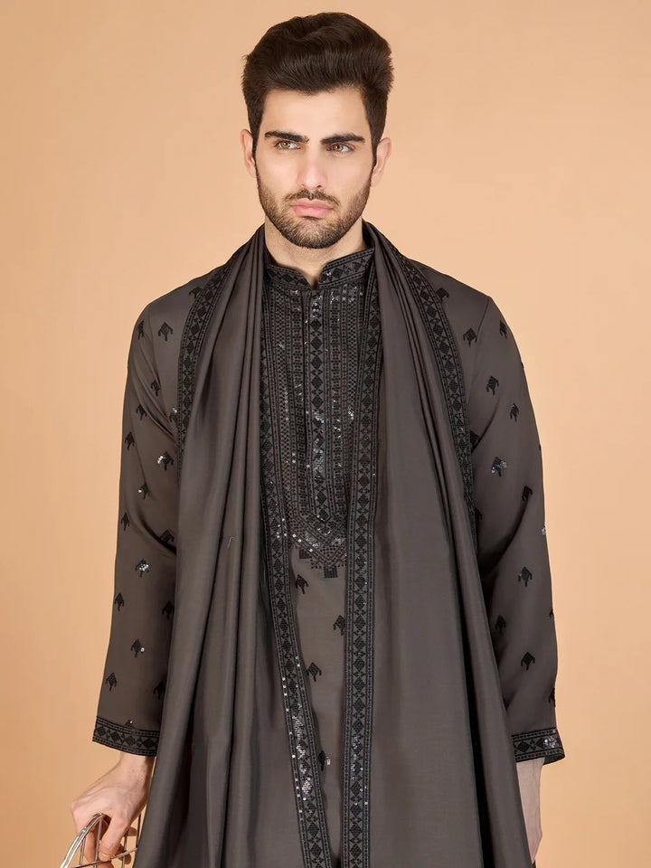 Upgrade your ethnic wardrobe with this premium brown viscose silk kurta for men, featuring intricate thread and sequin embroidery work. Crafted from luxurious viscose silk, this kurta offers a soft texture,...