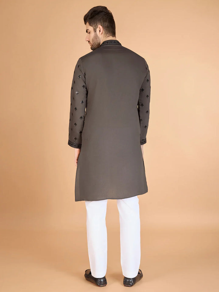 Pair this embroidered men's kurta with contrasting churidar or straight-fit pants for an elegant, sophisticated look. Designed for modern men who appreciate tradition with a contemporary twist, this kurta ensures effortless style and elegance. Make a lasting impression with this exquisite ethnic wear essential!
