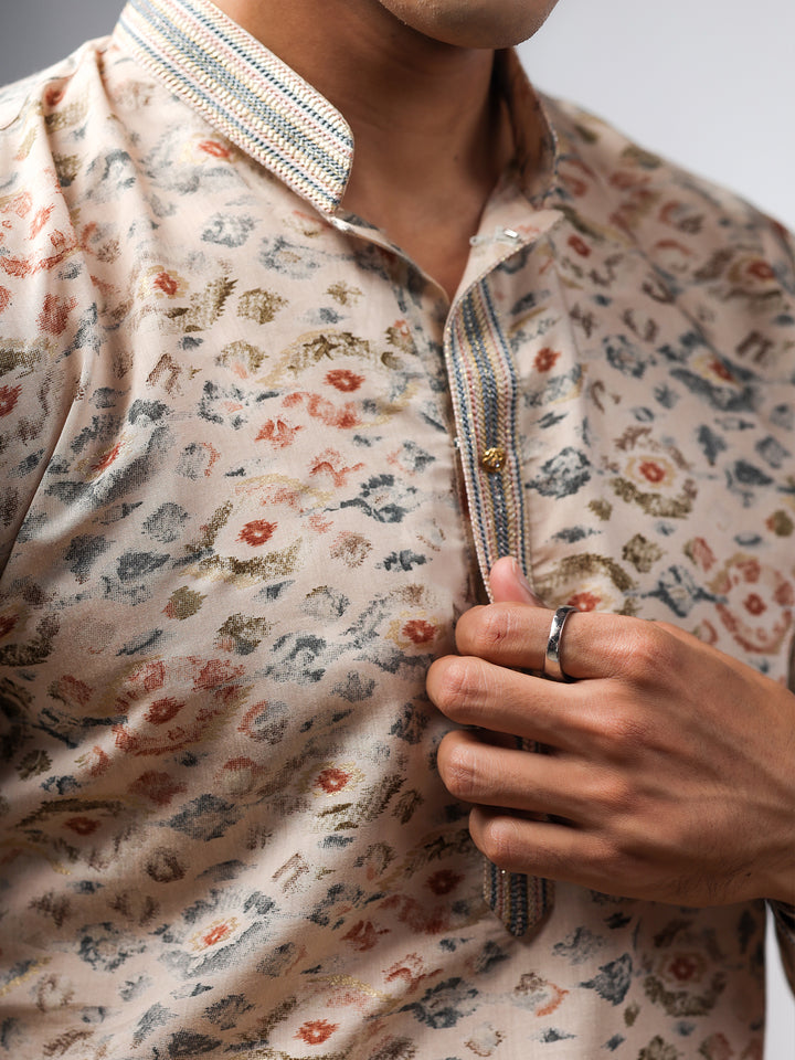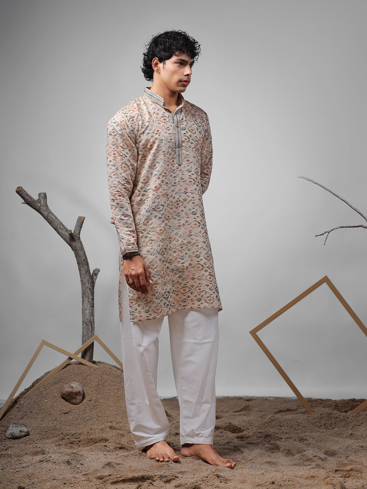 Step into timeless elegance with our Men’s Ceremonial Kurta Set crafted to perfection for weddings, festive gatherings, and traditional celebrations. The kurta, designed in luxurious cream silk fabric, features Pintex and printed detailing that adds a touch of sophistication and heritage charm. Paired with a classic white cotton bottom, this kurta set ensures unmatched comfort while keeping you stylish for long hours of rituals and ceremonies.