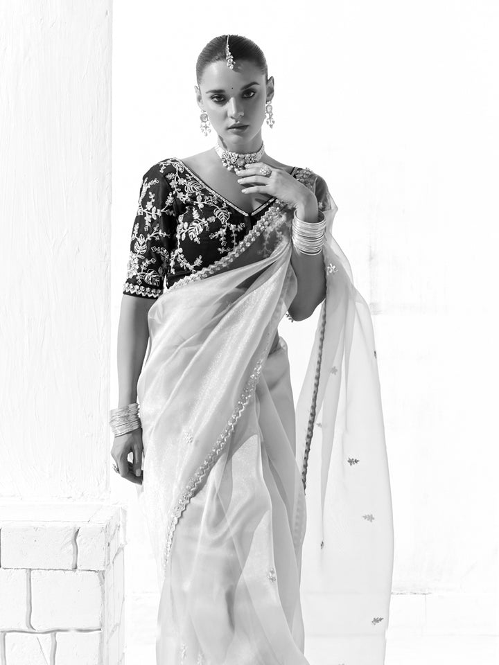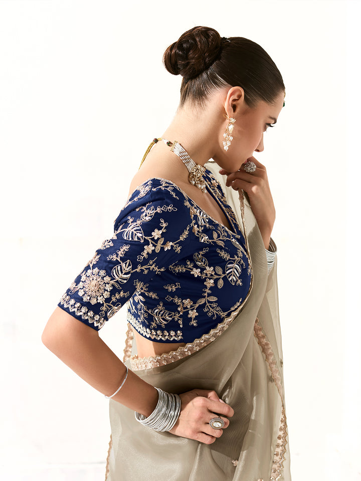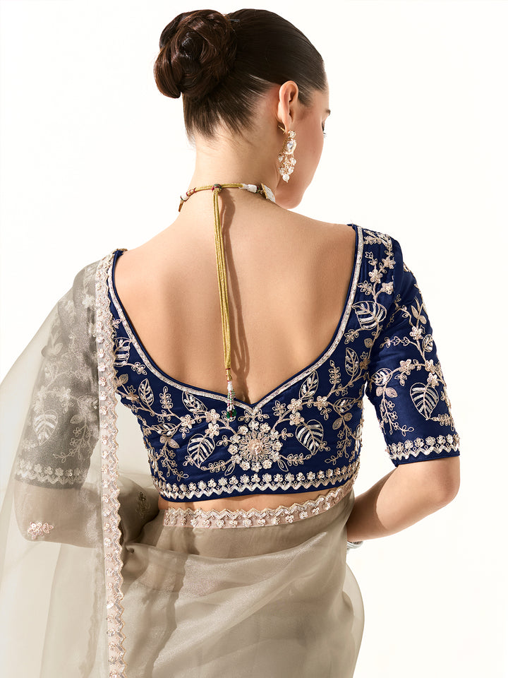 Paired with a Blue Designer Blouse featuring heavy sleeve and back embroidery work, this ensemble balances subtle sophistication with statement elegance. The blouse’s detailed craftsmanship adds depth and contrast to the saree’s ethereal silver palette, creating a complete, luxurious look. Whether you're dressing for Diwali, a wedding function, or an upscale evening soiree, this saree is the ideal fusion of grace, glamour, and Google-worthy style.