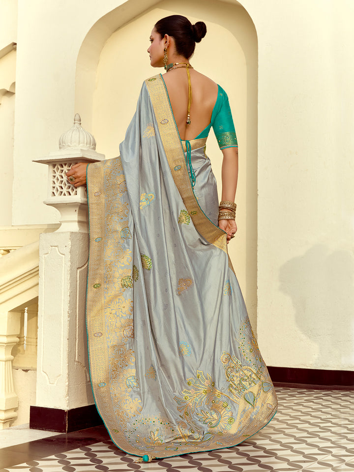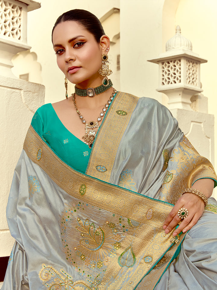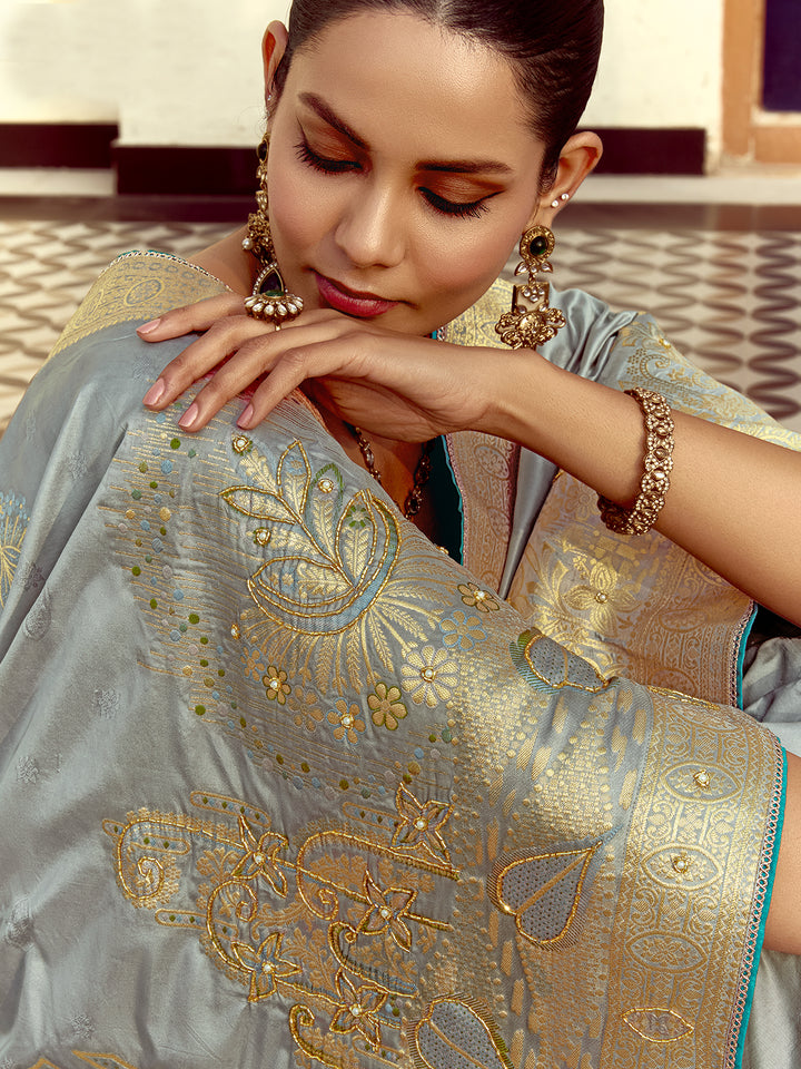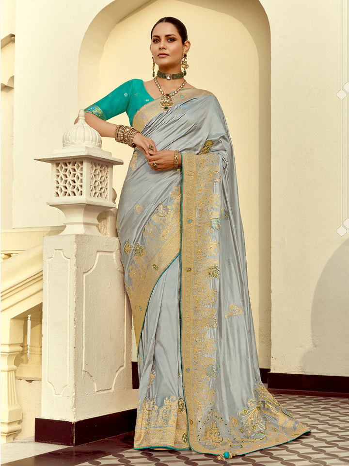 Paired with a contrasting Sea Green Designer Blouse that showcases heavy back and sleeve embroidery, this ensemble captures the essence of high-end ethnic fashion. Ideal for festive celebrations, receptions, and cultural events, this saree is a top pick for fashion-forward women looking to make a statement. Style it with bold jhumkas and a sleek clutch for an Instagram-worthy look.