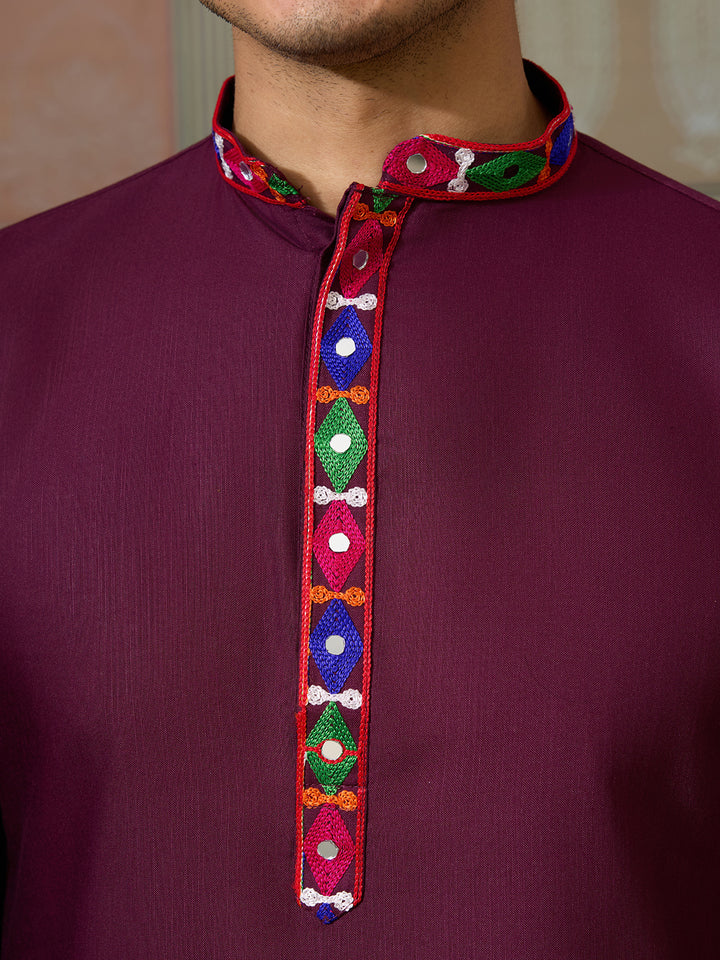Bring timeless elegance to your festive and wedding wardrobe with this wine cotton silk kurta for men, beautifully designed with multi-thread embroidery and mirror work. The rich wine shade adds a...