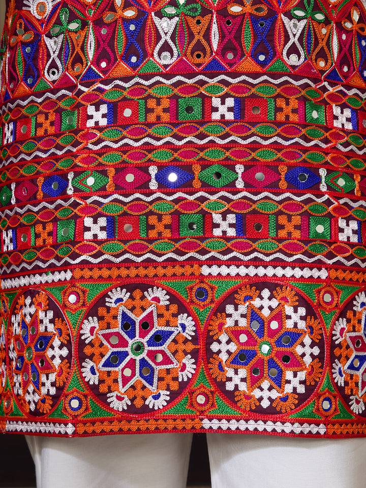 Bring timeless elegance to your festive and wedding wardrobe with this wine cotton silk kurta for men, beautifully designed with multi-thread embroidery and mirror work. The rich wine shade adds a royal touch, while the premium cotton silk fabric ensures both comfort and sophistication. Perfectly tailored for weddings, cultural celebrations, and traditional gatherings, this kurta strikes the ideal balance between modern ethnic fashion and classic Indian craftsmanship.