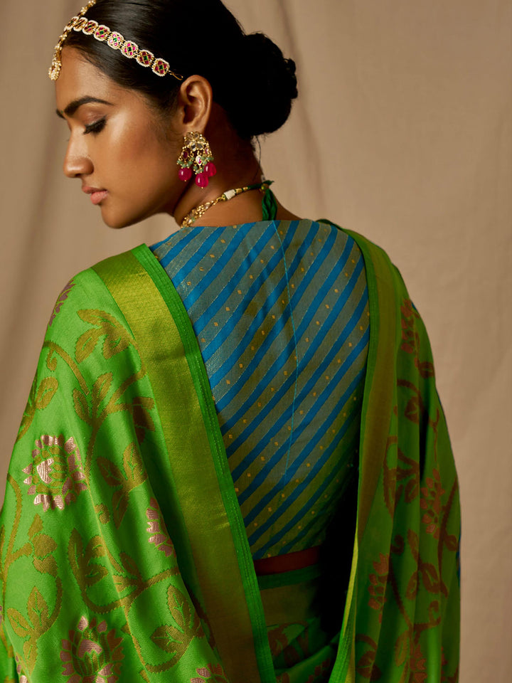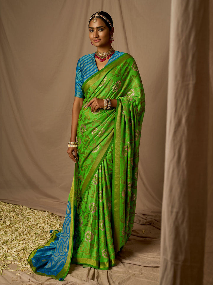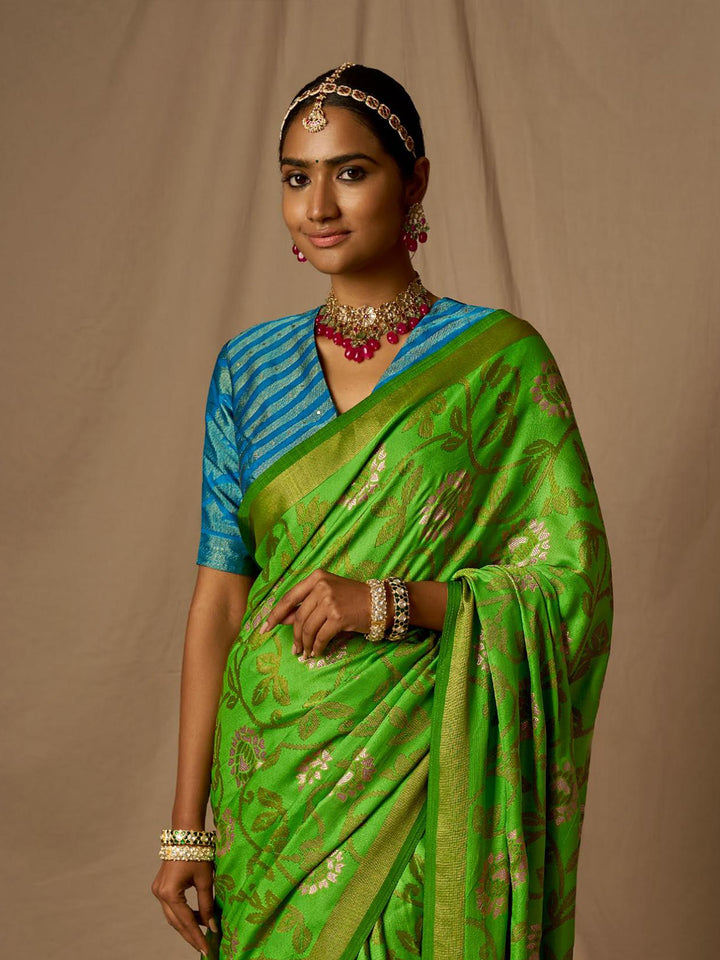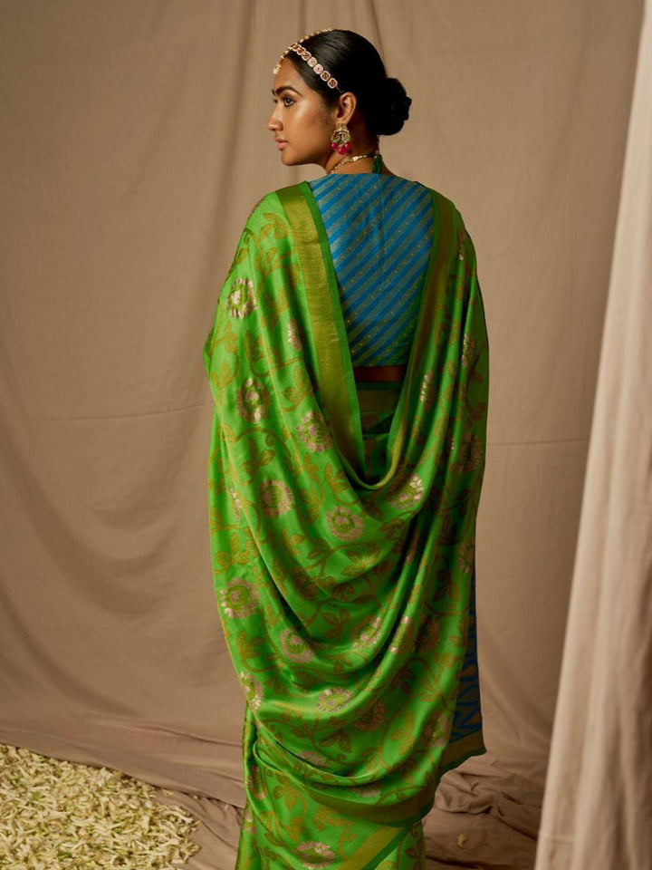 Green Silk Saree with Sky Blue Foil Print Blouse