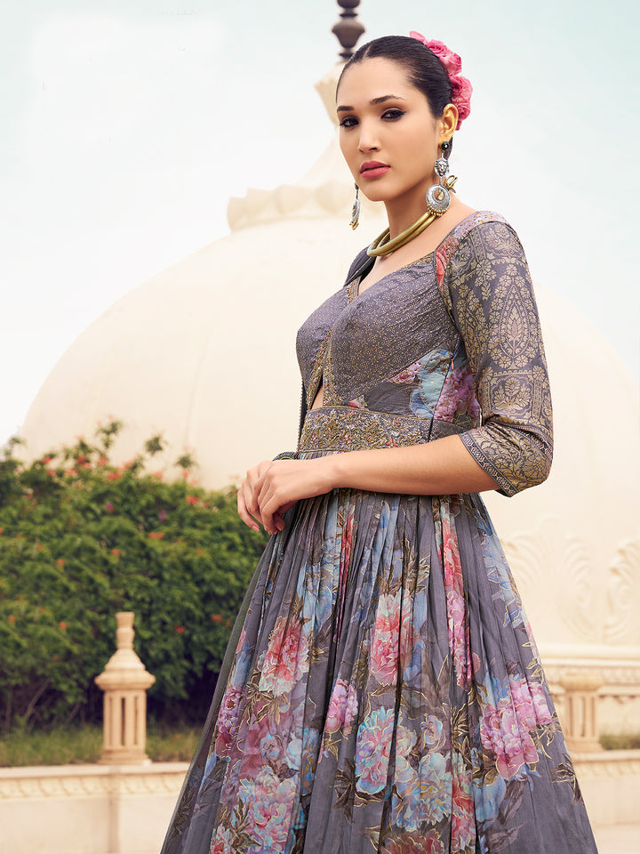 Elevate your ethnic fashion game with this elegant grey Indo-Western lehenga crafted from premium PV silk fabric, adorned with shimmering foil prints and exquisite handwork detailing. The fusion of contemporary design with traditional craft makes this lehenga a perfect choice for wedding receptions, sangeet nights, festive celebrations, and modern bridal events. The sleek silhouette and rich grey hue exude sophistication and charm, ideal for women who want to stand out with grace.