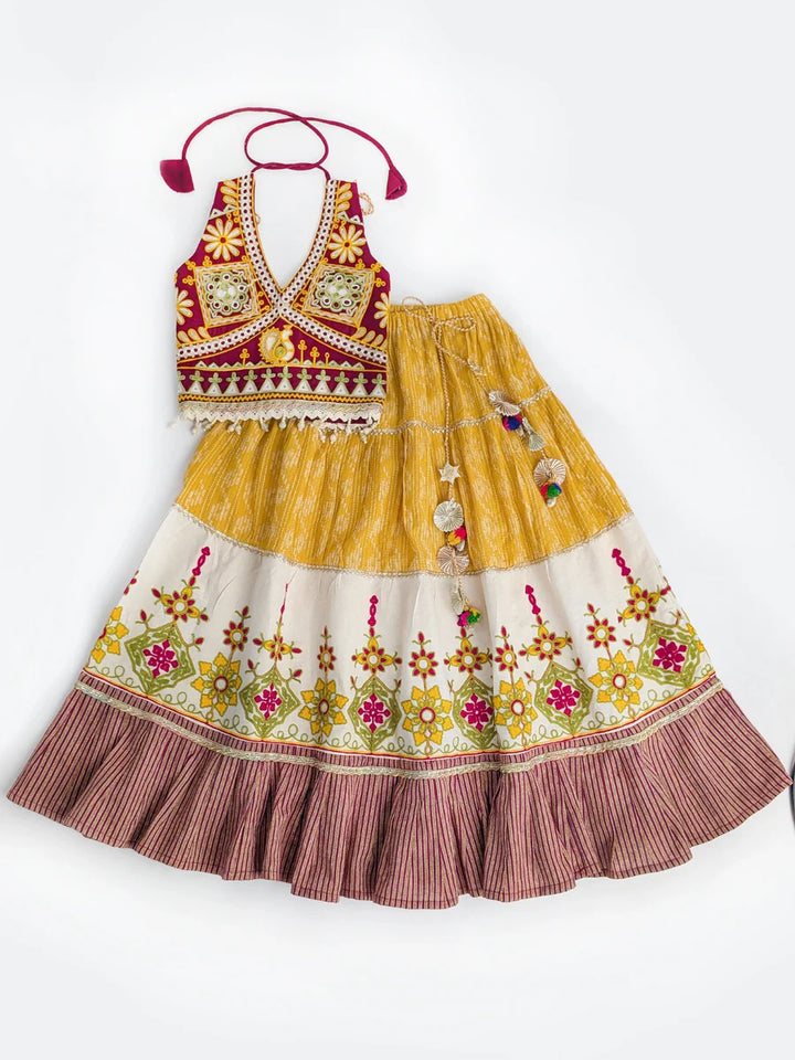 Ideal for Navratri, Diwali, weddings, and ethnic photoshoots, this Chaniya Choli is tailored for girls aged 6 months to 10 years. Its vibrant hues and delicate craftsmanship make it a standout choice for festive gatherings, while the flared lehenga adds playful charm. Whether for family functions or cultural events, this outfit ensures your little star shines with unmatched elegance and tradition.