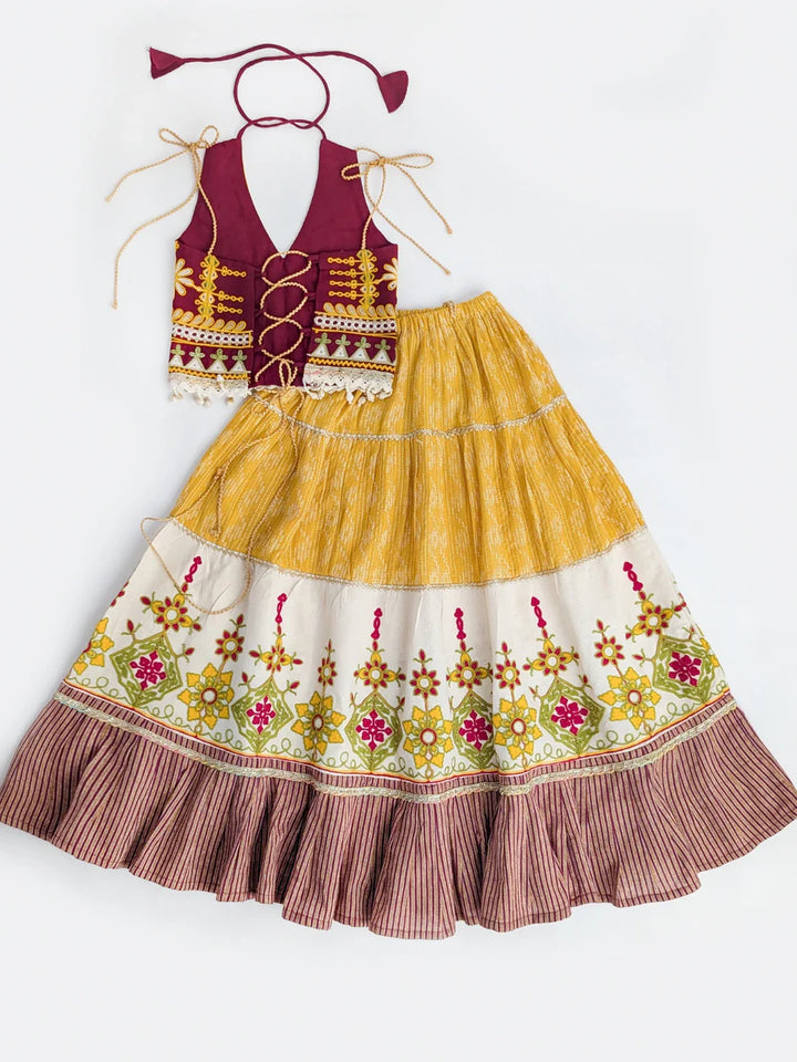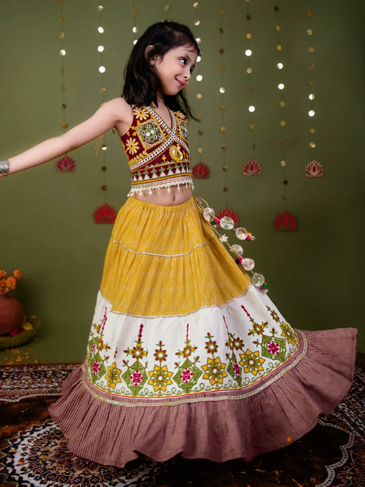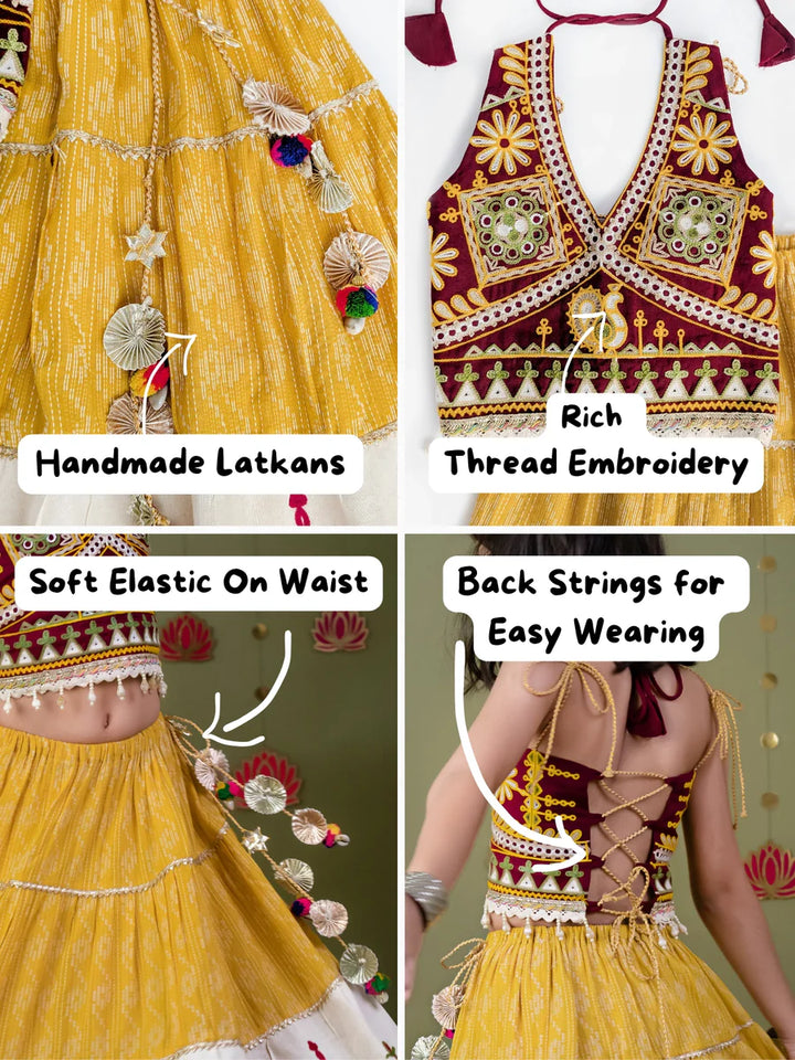 Dress your little one in timeless elegance with our Mustard & Wine Chaniya Choli Set, a perfect fusion of tradition and comfort. The richly embroidered wine blouse, adorned with mirror-style accents, pairs beautifully with the vibrant mustard lehenga, creating a festive look that’s both graceful and eye-catching. Designed with breathable cotton lining and adjustable tie-ups, this outfit ensures all-day comfort while keeping your child stylish during every celebration.