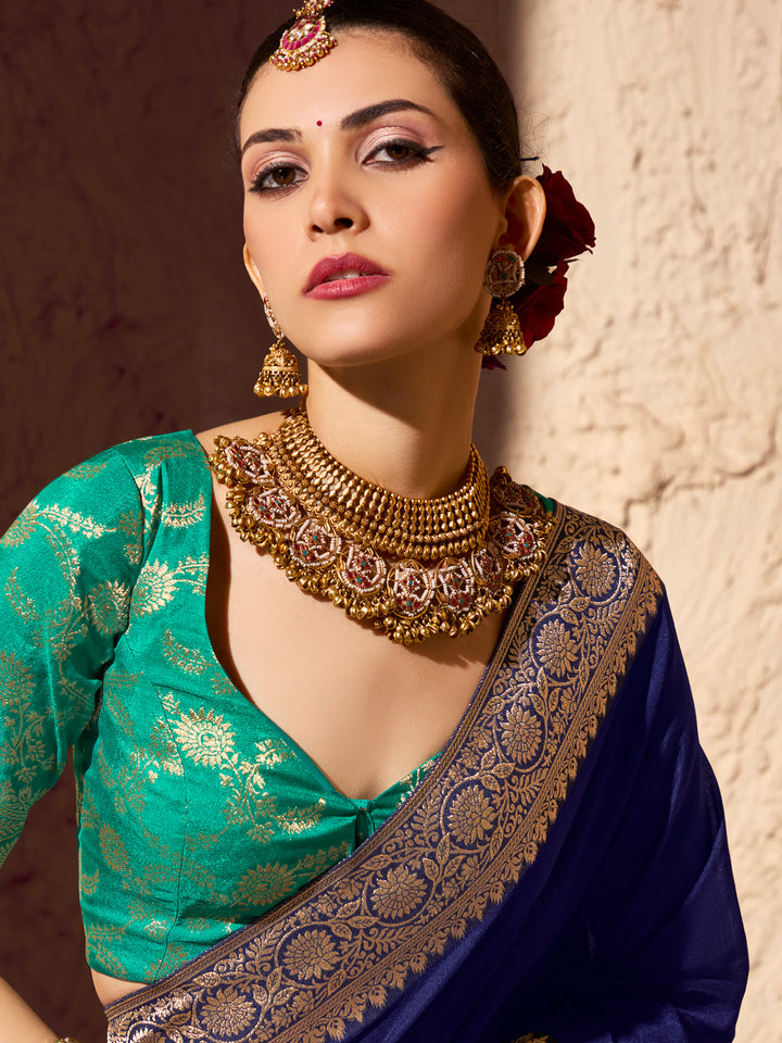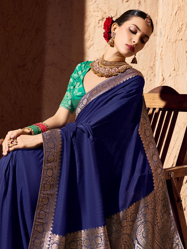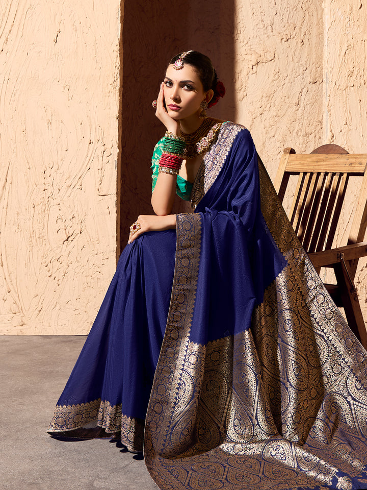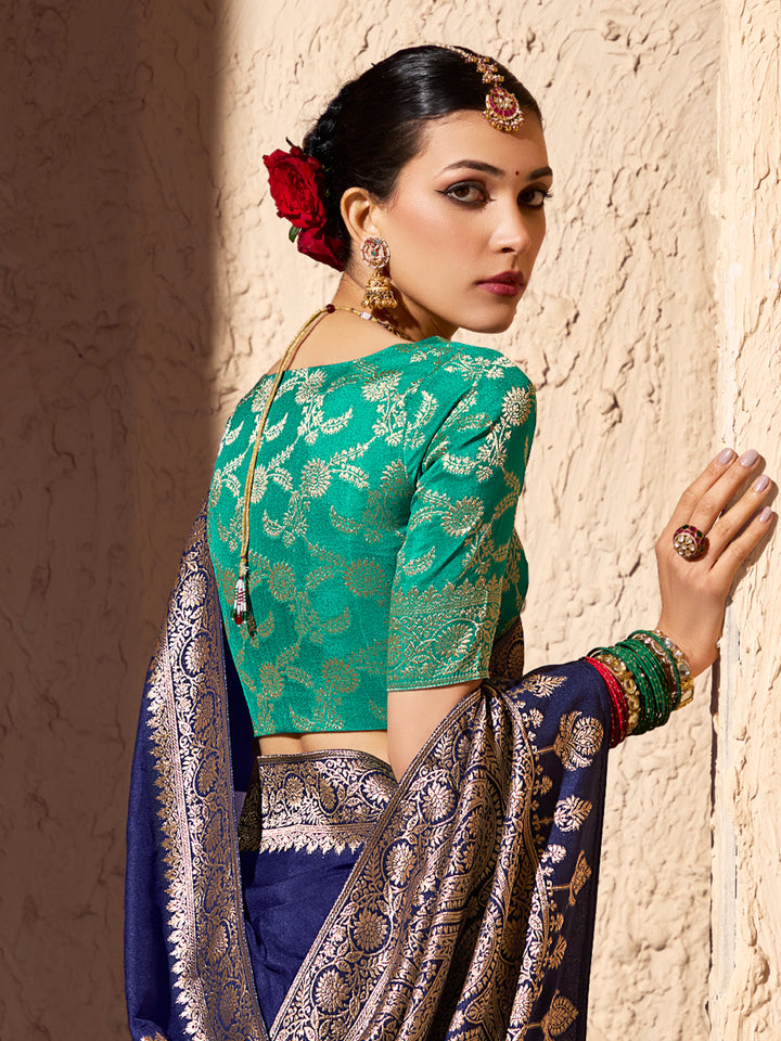 The striking Navy Blue shade of the saree is beautifully complemented by an unstitched blouse piece in a vibrant Teal Green Crepe Georgette fabric, creating a sophisticated and trending color contrast. The combination of rich blue and vivid green makes this ensemble a standout piece, suitable for traditional occasions, grand parties, or as a sophisticated wedding guest outfit. Shop this unique Crepe Georgette Zari Weaving ensemble to add a touch of timeless Indian tradition and contemporary style to your collection.