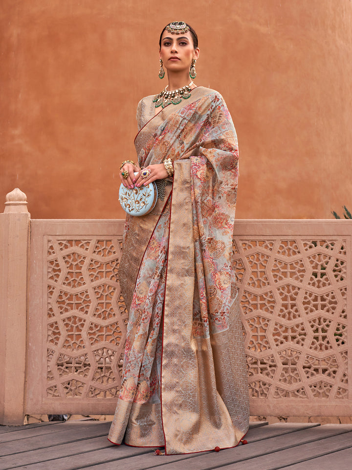 Fabric: Organza With Jacquard Border And Pallu With Weaving Jacquard Butti With Digital Print