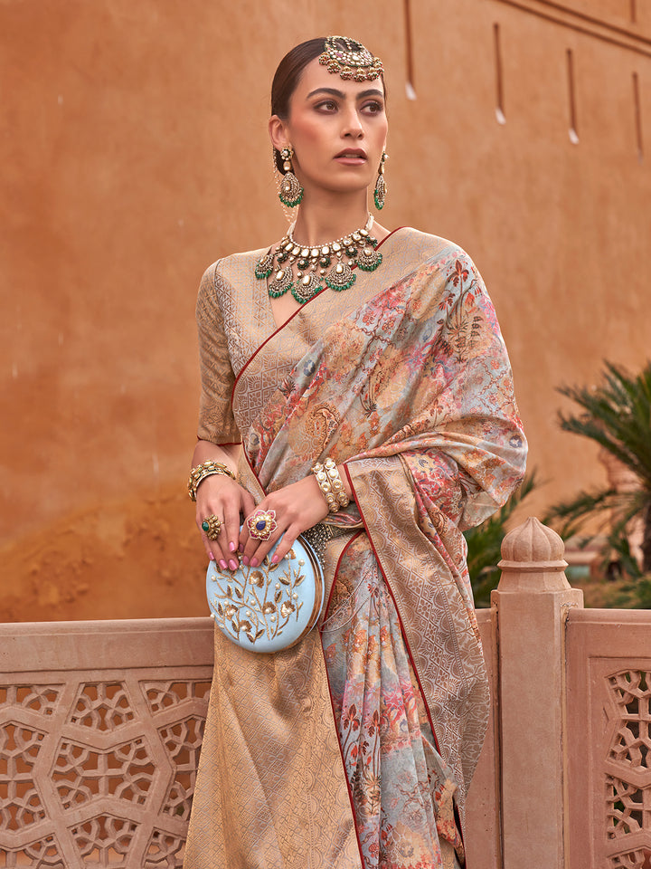 Paired with a matching golden organza blouse adorned with digital print detailing, this saree radiates sophistication and cultural finesse. Its lightweight texture, graceful drape, and modern craftsmanship make it the ideal choice for women who love to blend classic beauty with contemporary flair. Style it with heritage jewelry and statement heels to complete your regal look. Whether you're shopping for festive collections or the latest trending sarees online, this designer saree is your perfect wardrobe addition.