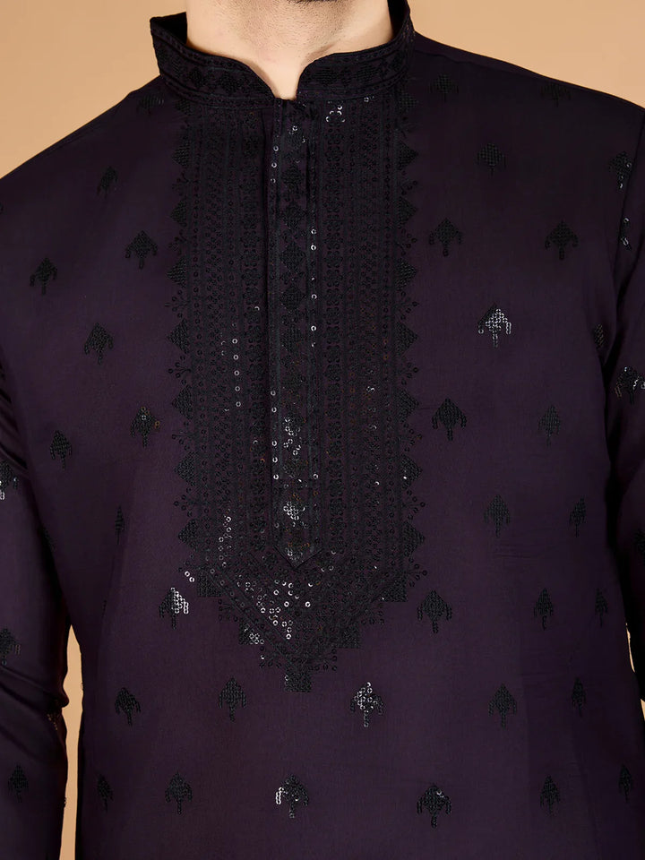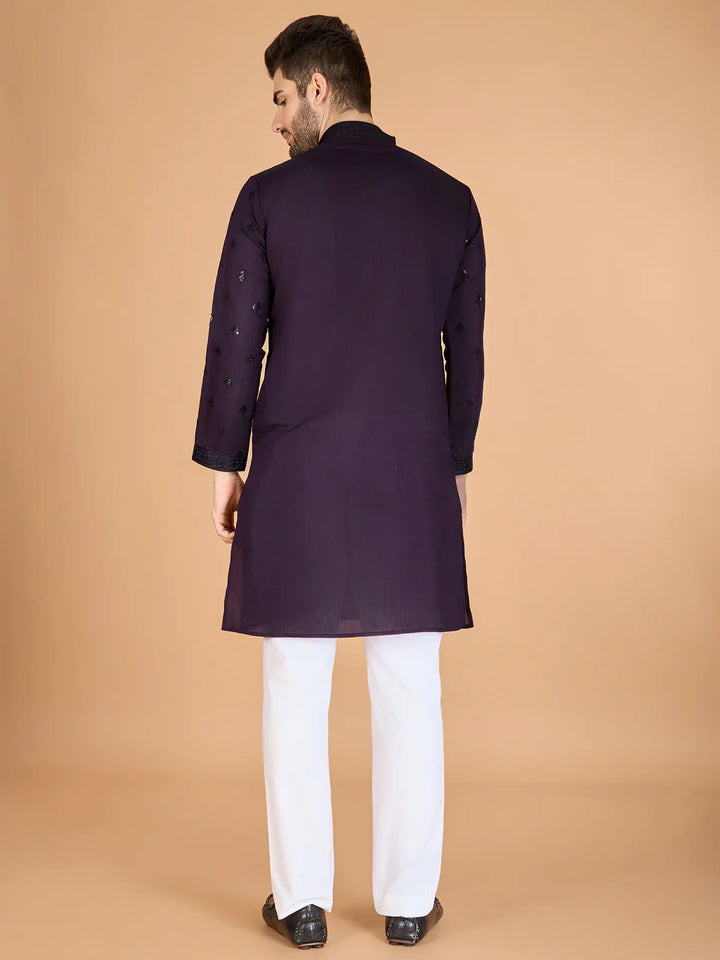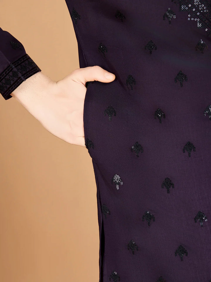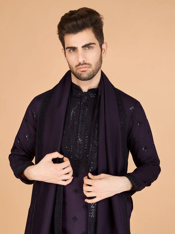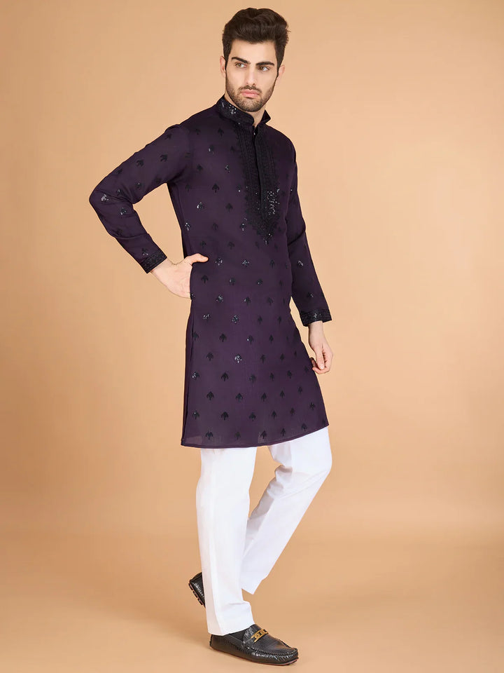 Upgrade your ethnic wardrobe with this Premium Purple Viscose Silk Kurta for Men, featuring exquisite thread and sequin embroidery work. Crafted from luxurious viscose silk, this kurta exudes elegance and sophistication, making it a perfect choice for weddings, festive celebrations, and special occasions. The rich purple hue adds a royal charm, ensuring you stand out in any gathering.
