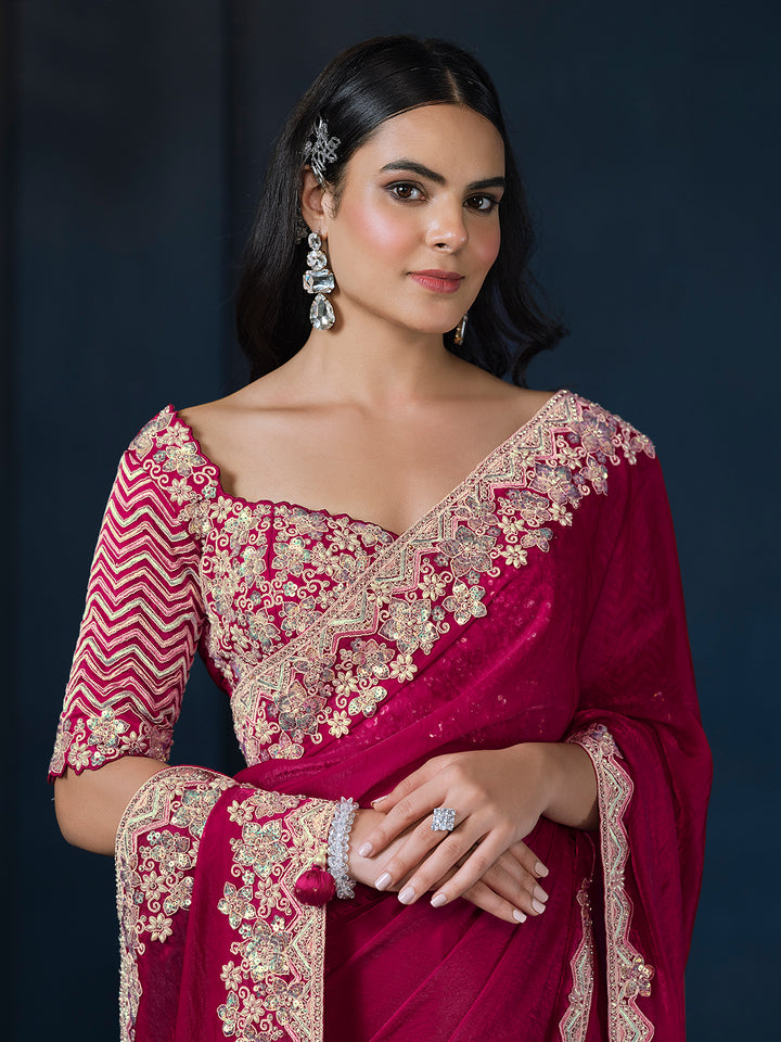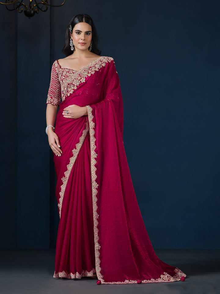 Rani Pink Two Tone Satin Silk Saree with Sequins & Hand Work | Party Wear Raw Silk Blouse