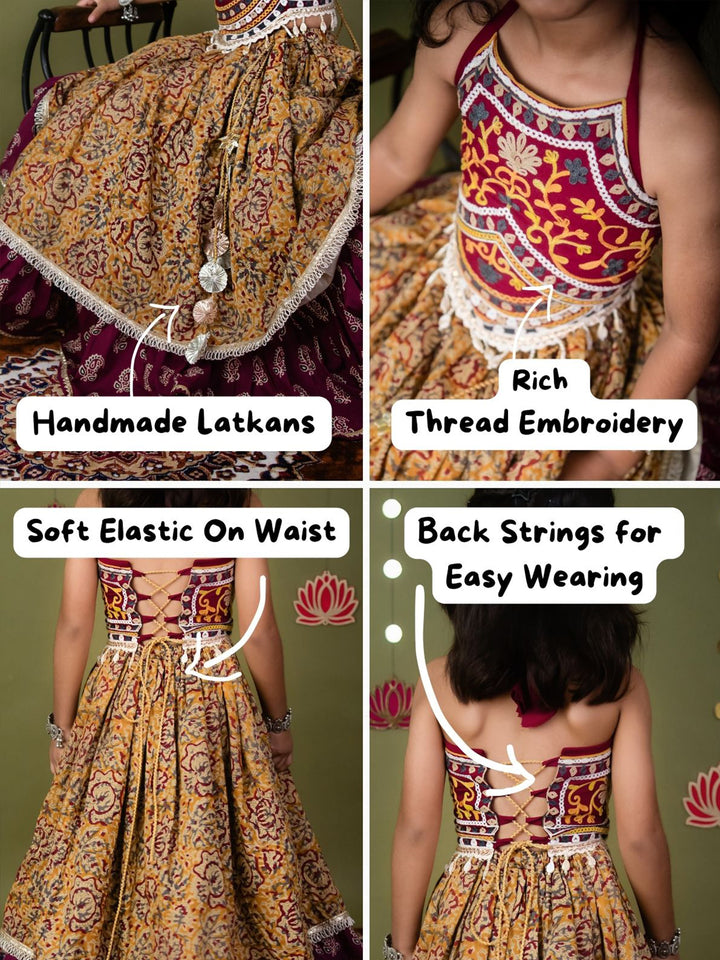 Celebrate the spirit of Navratri with the Tarini Lehenga Choli Set, a stunning blend of tradition and modern elegance. The regal maroon halter-neck blouse is adorned with intricate mustard and ivory embroidery, inspired by royal heritage motifs that make you stand out in every Garba circle. Paired with a vibrant mustard Ajrakh-printed skirt and deep maroon block-printed border, this ensemble is a timeless fusion of craft and culture. The delicate ivory lace trims and golden tassels add a touch of festive sparkle, making it perfect for your Navratri 2025 wardrobe.