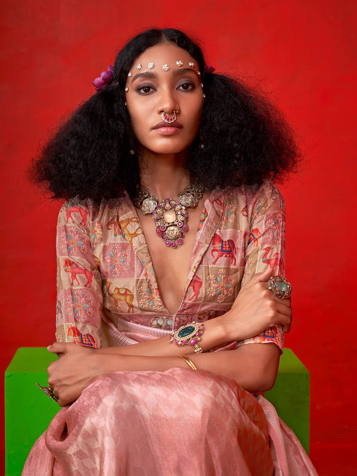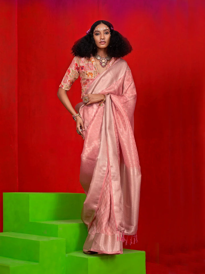 Paired with a premium Satin Position Print blouse in a matching pink hue, this ensemble balances softness and structure for a flattering silhouette. The combination of handloom artistry and modern satin flair brings a unique fusion that turns heads at any celebration. Whether you're attending a Diwali party or a family wedding, this saree is your go-to pick for timeless glamour. Add statement jewelry and a bold lip to complete your festive look. Elevate your ethnic wardrobe with a piece that speaks of luxury, tradition, and modern Indian elegance.