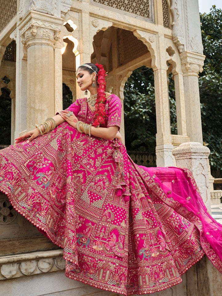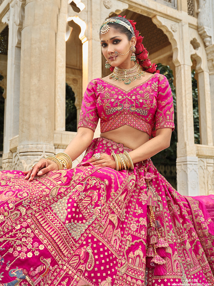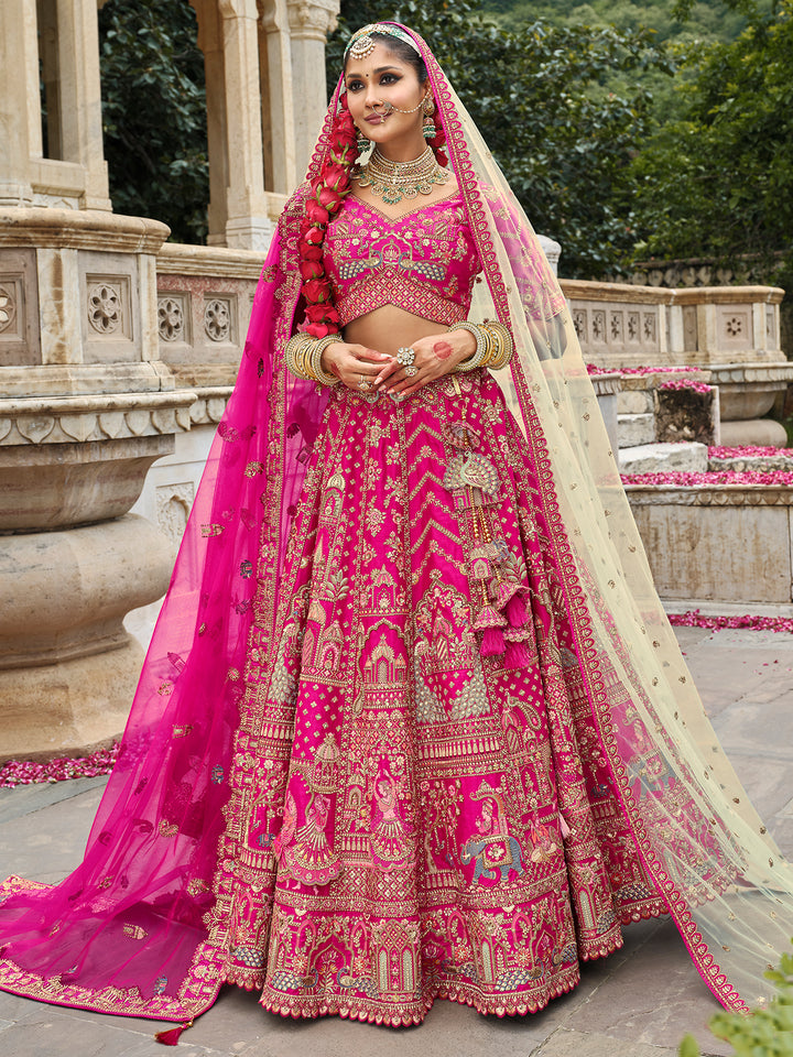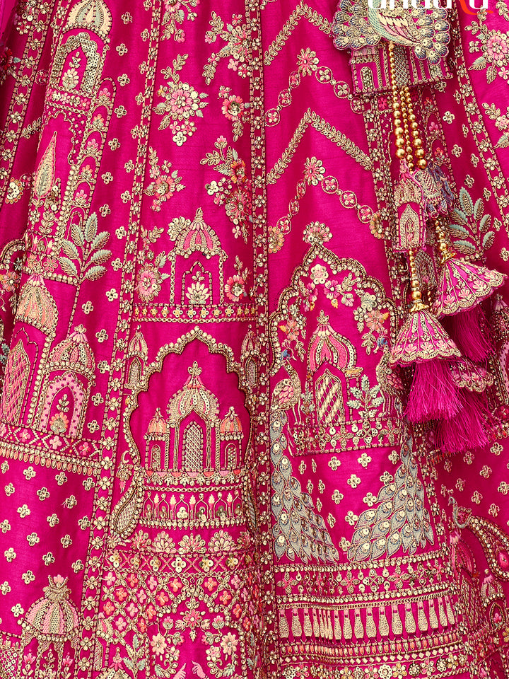 Elevate your wedding look with this exquisite pink silk lehenga, beautifully adorned with intricate khatli embroidery and heavy work detailing. Crafted from premium silk, the lehenga and blouse offer a luxurious feel, while the net dupatta with elegant work completes the traditional ensemble. Perfect for brides and wedding attendees, this designer lehenga blends timeless craftsmanship with modern elegance, making it a must-have for grand celebrations.