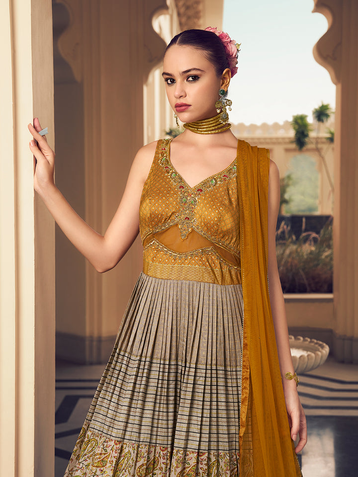 Yellow Indo-Western Lehenga in Silk with Foil Print & Handwork