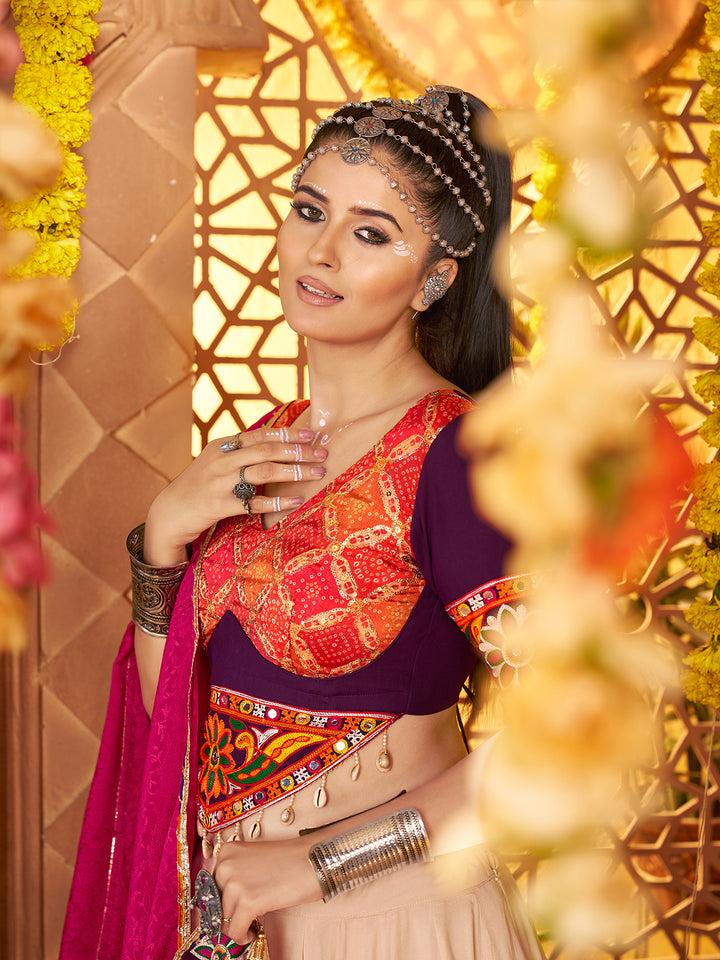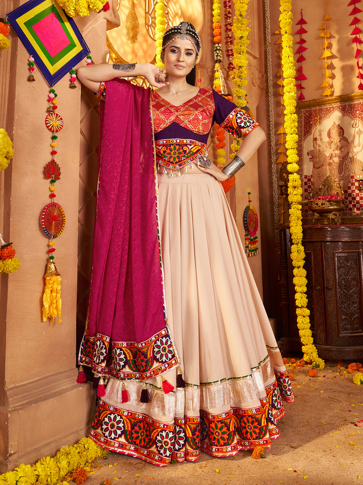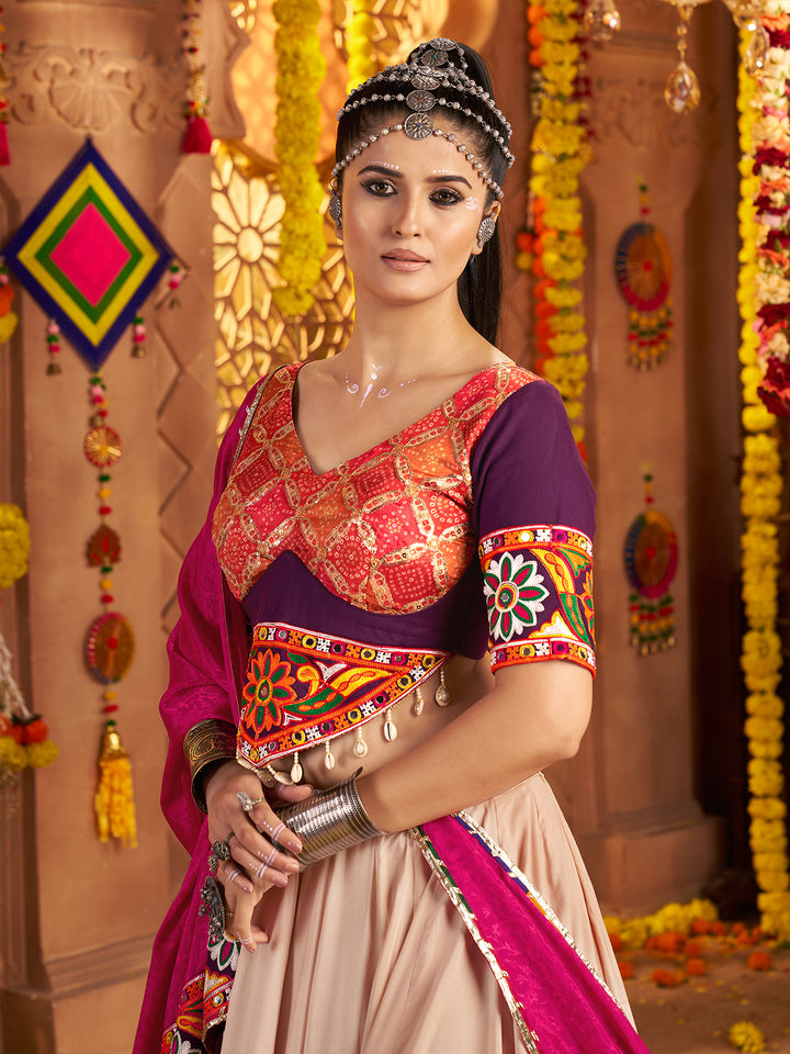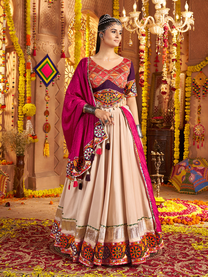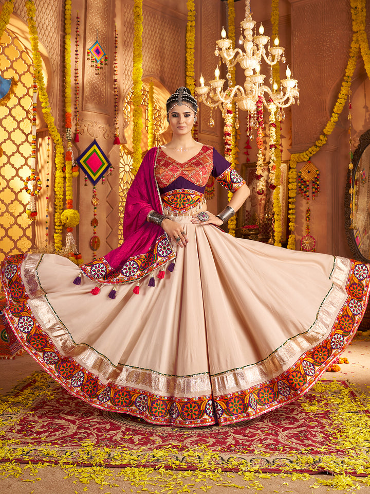 Beige Viscose Rayon Navratri Lehenga Choli with Mirror & Thread Embroidery
