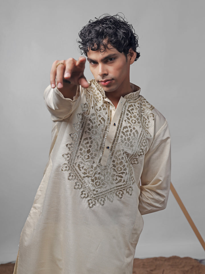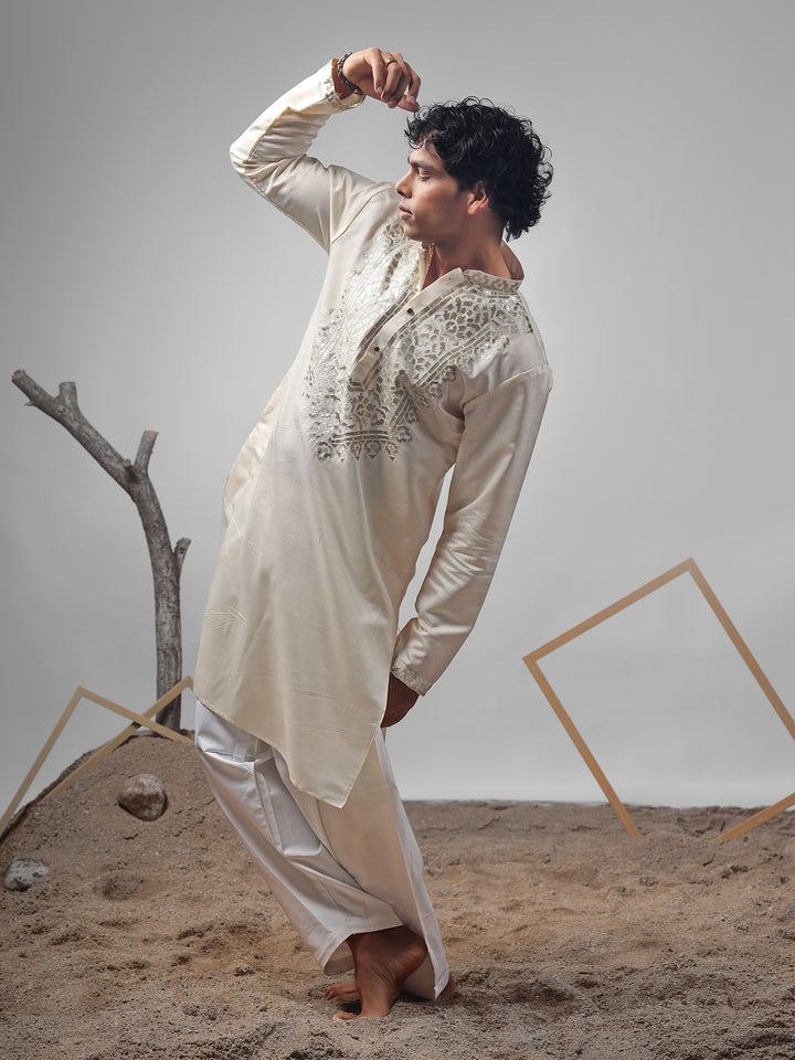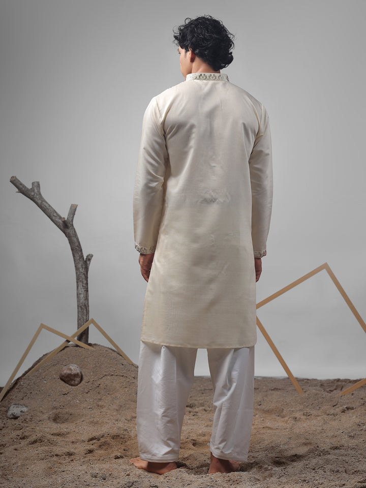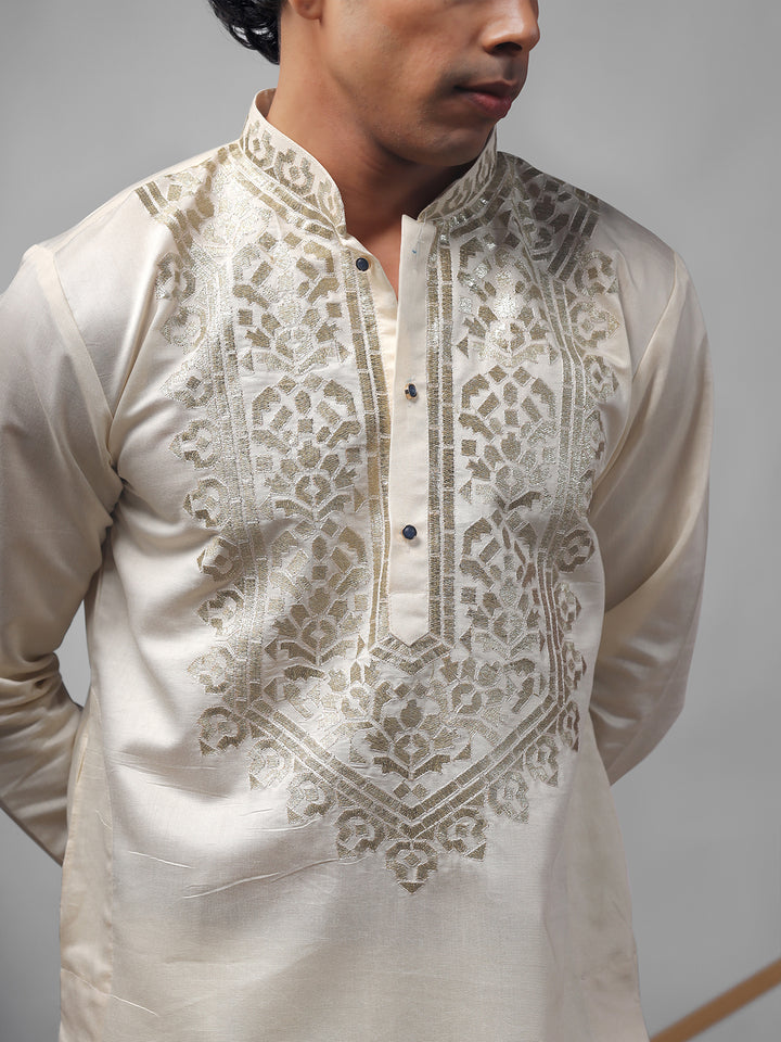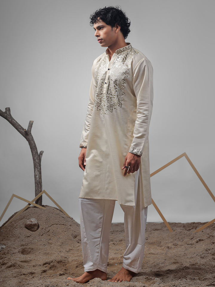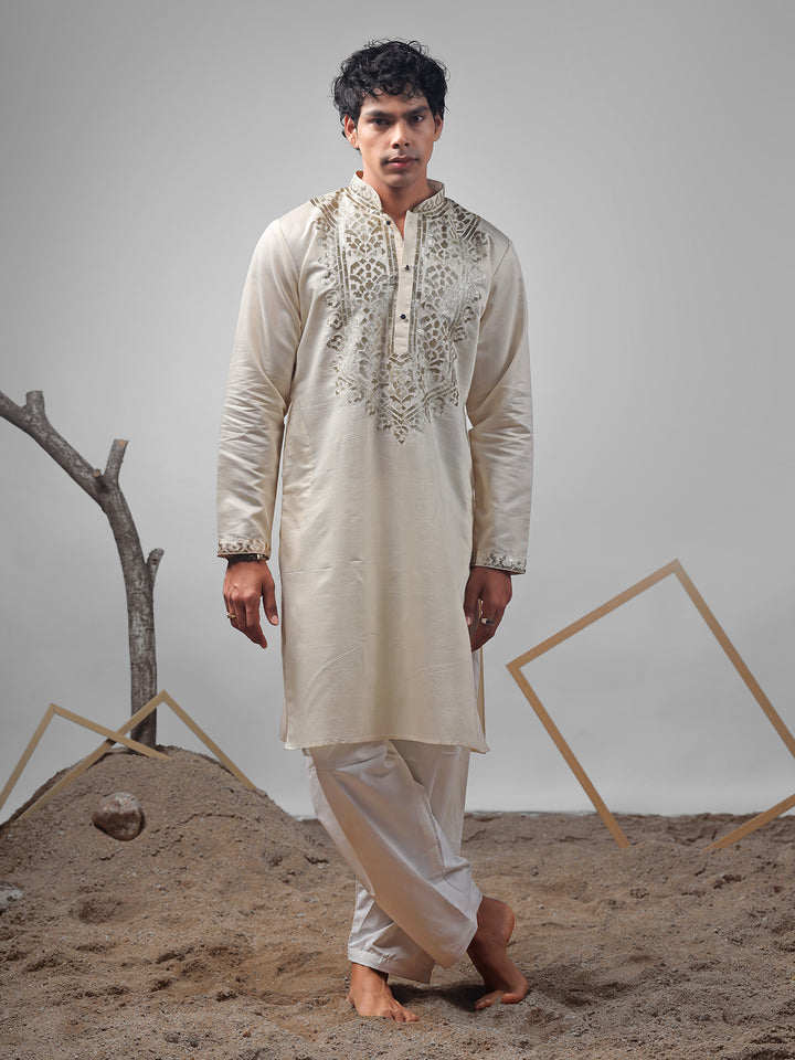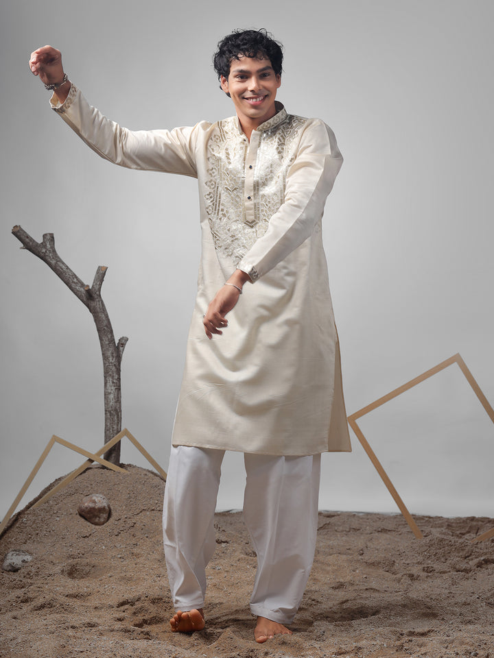 Cream Silk Kurta Set for Men In Embroidery & Foil Design