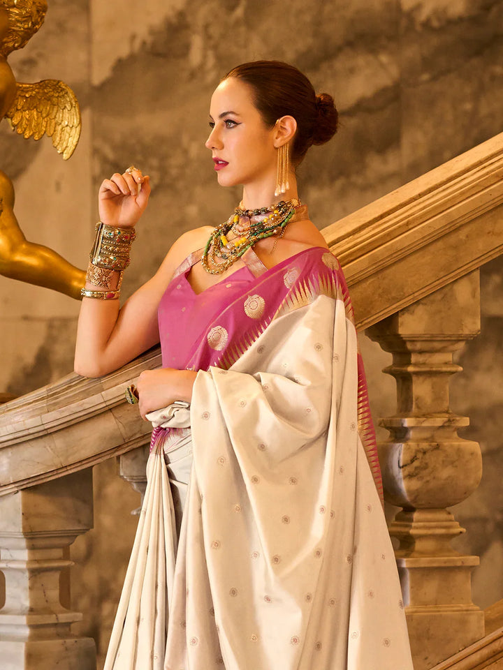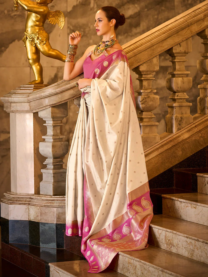 The look is completed with a contrasting pink silk blouse, offering a vibrant yet sophisticated flair. Whether you're styling it with antique gold jewelry or modern statement pieces, this saree promises to turn heads. The luxurious texture, intricate weave, and festive appeal make it a must-have for your ethnic wardrobe. Don’t just wear a saree—make a statement.