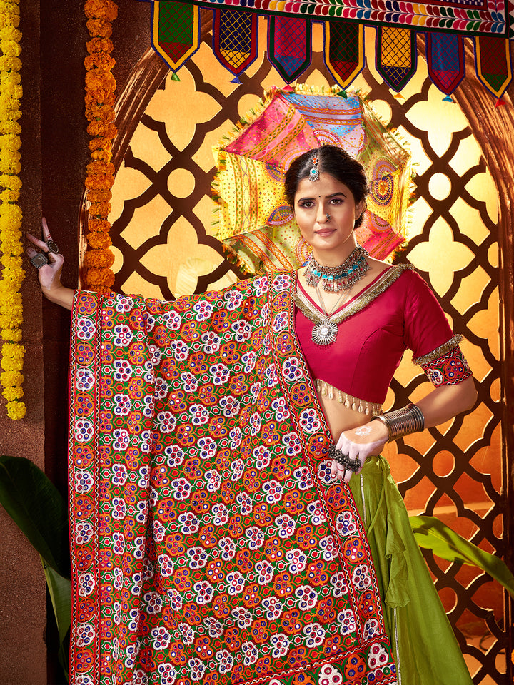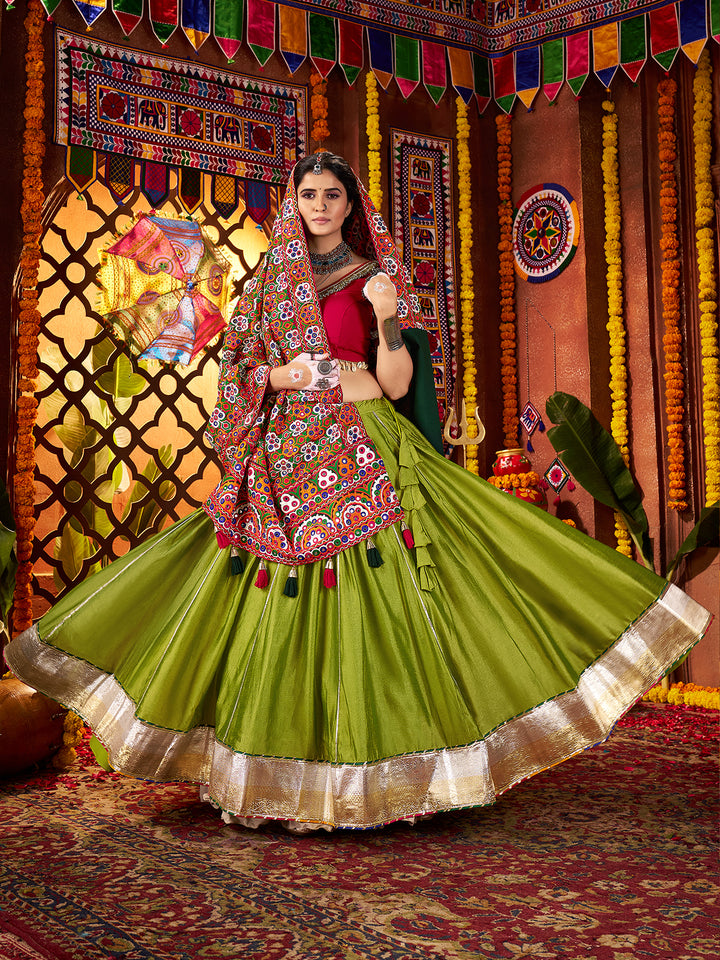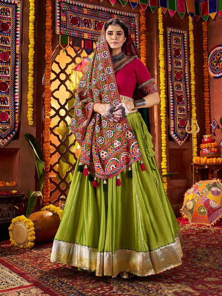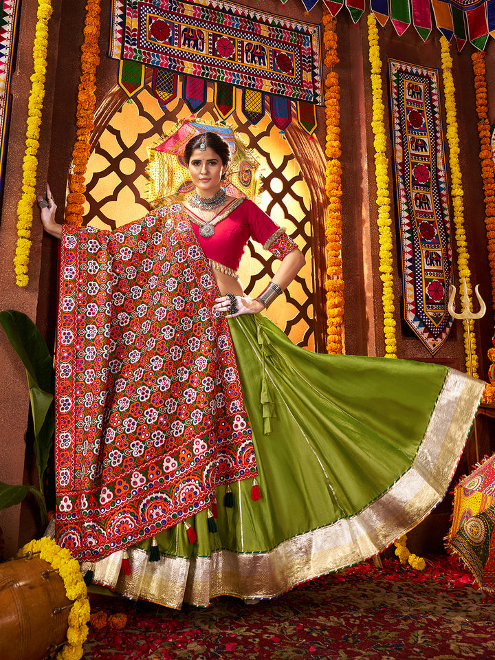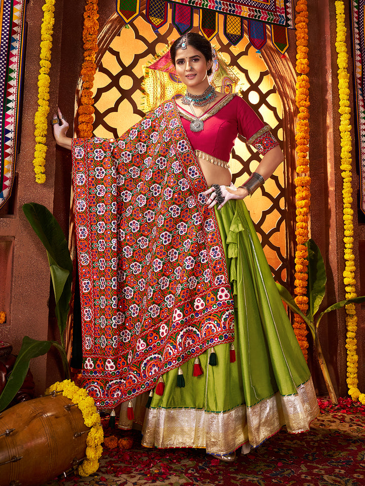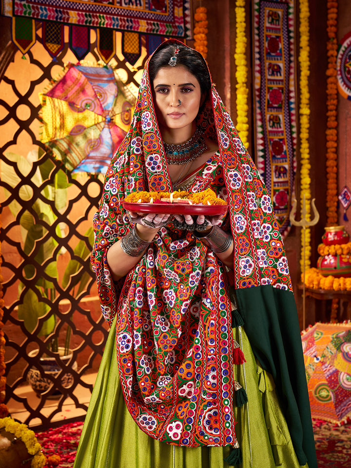 Green Silk Navratri Lehenga Choli with Mirror and Thread Embroidery Work – Festive Cotton Dupatta Set
