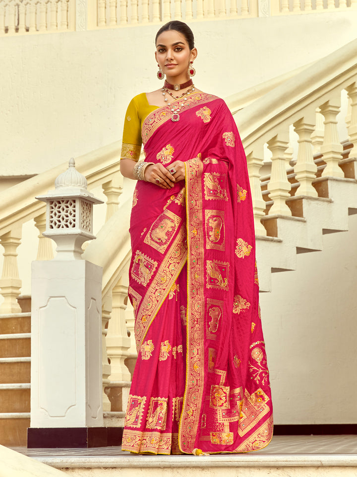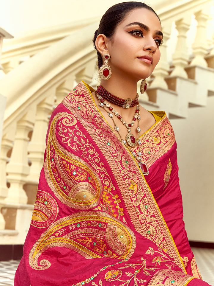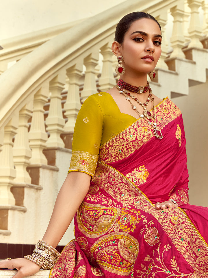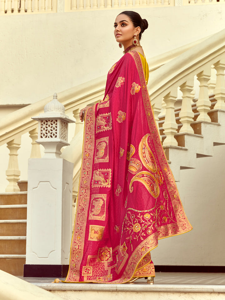 Red Organza Tissue Saree with Heavy Work Border & Yellow Designer Blouse – Party & Festival Wear